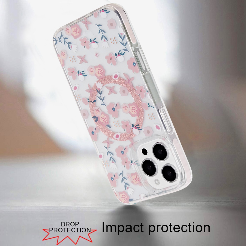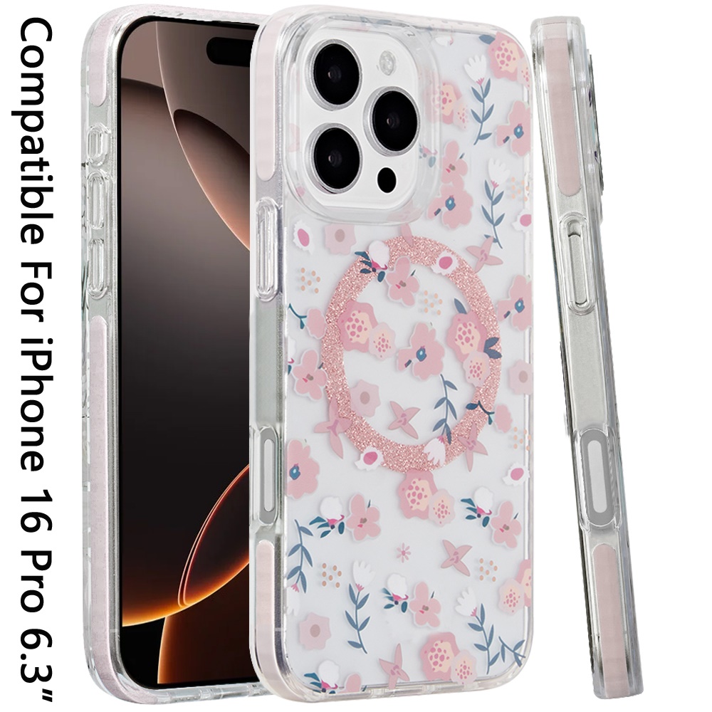 For iPhone 16 Pro 6.3 inch Magnetic Double Layer IMD Design Case - Pink Floral