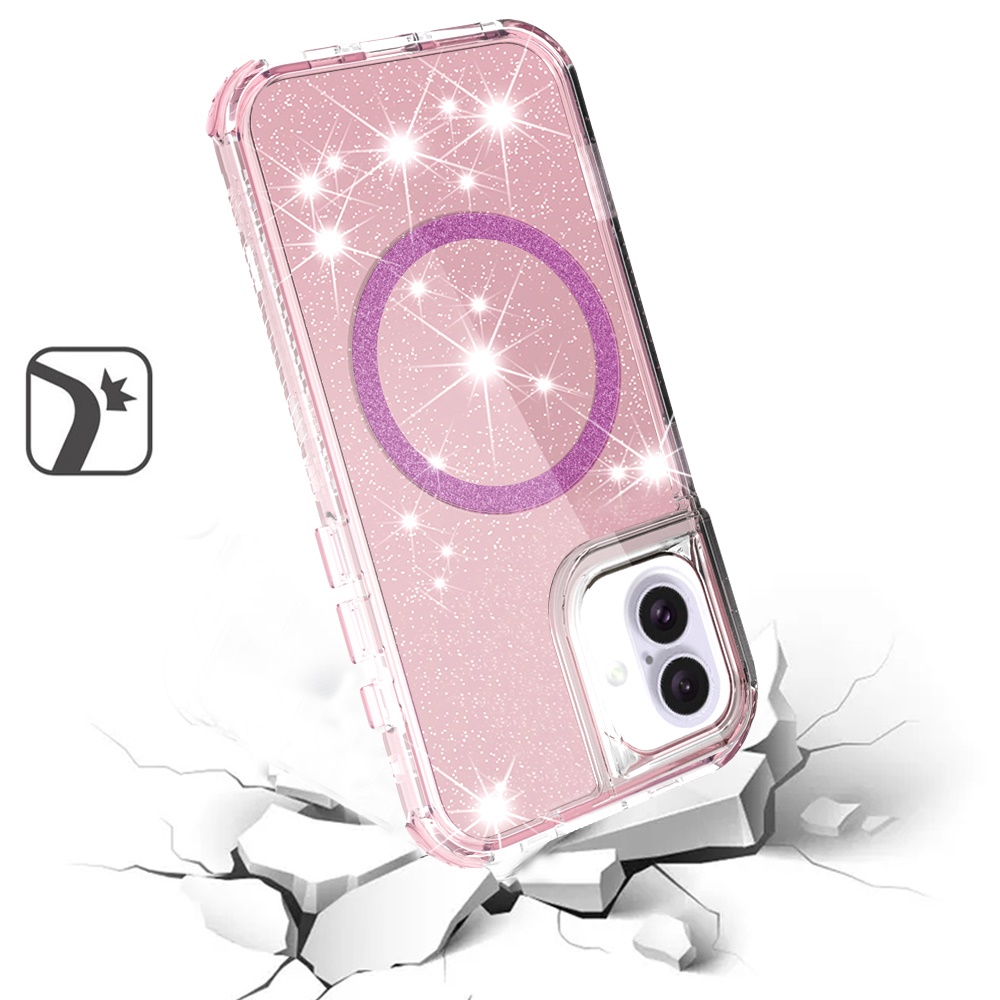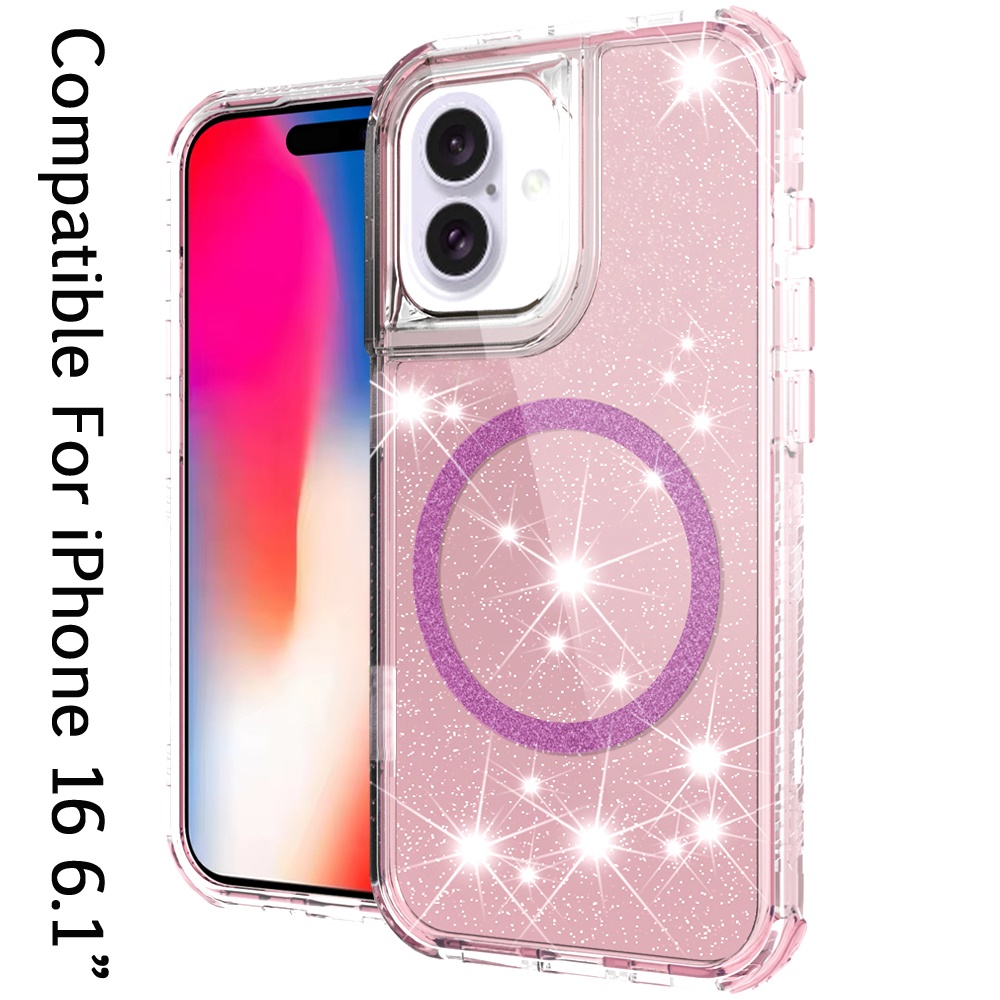 For iPhone 16 6.1 inch Magnetic Ring Glitter 3in1 Hybrid Case Cover - Pink