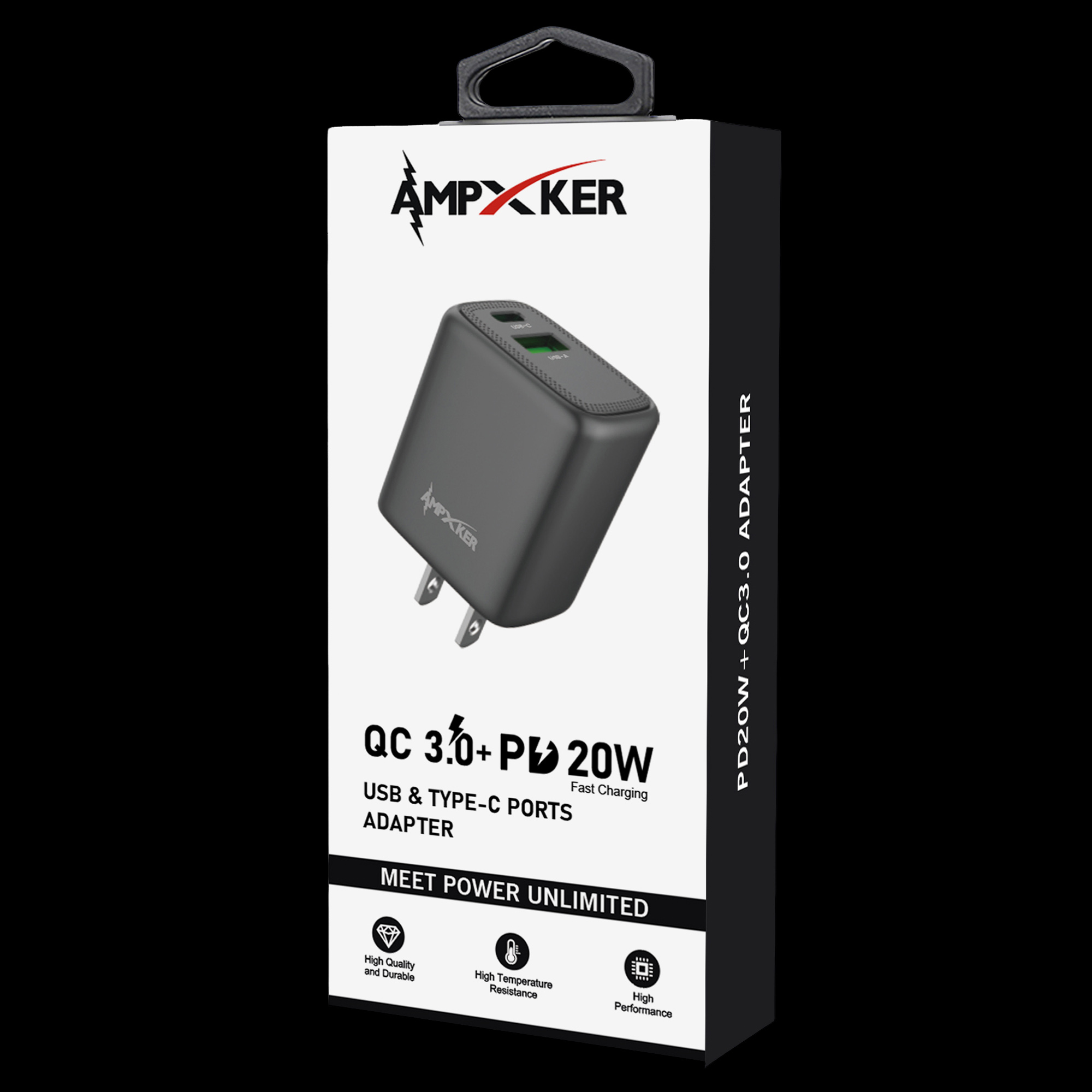 USB & Type C (PD) - Dual Port - UL Certified - Adapter - QC 3.0 Amp + PD 20W - BLACK (LANE A7) (item#10)