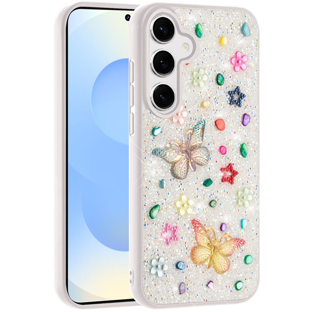 For Samsung s25 Plus/s24 Plus Butterfly Ornaments Diamond Bling Glitter Hybrid Case - White