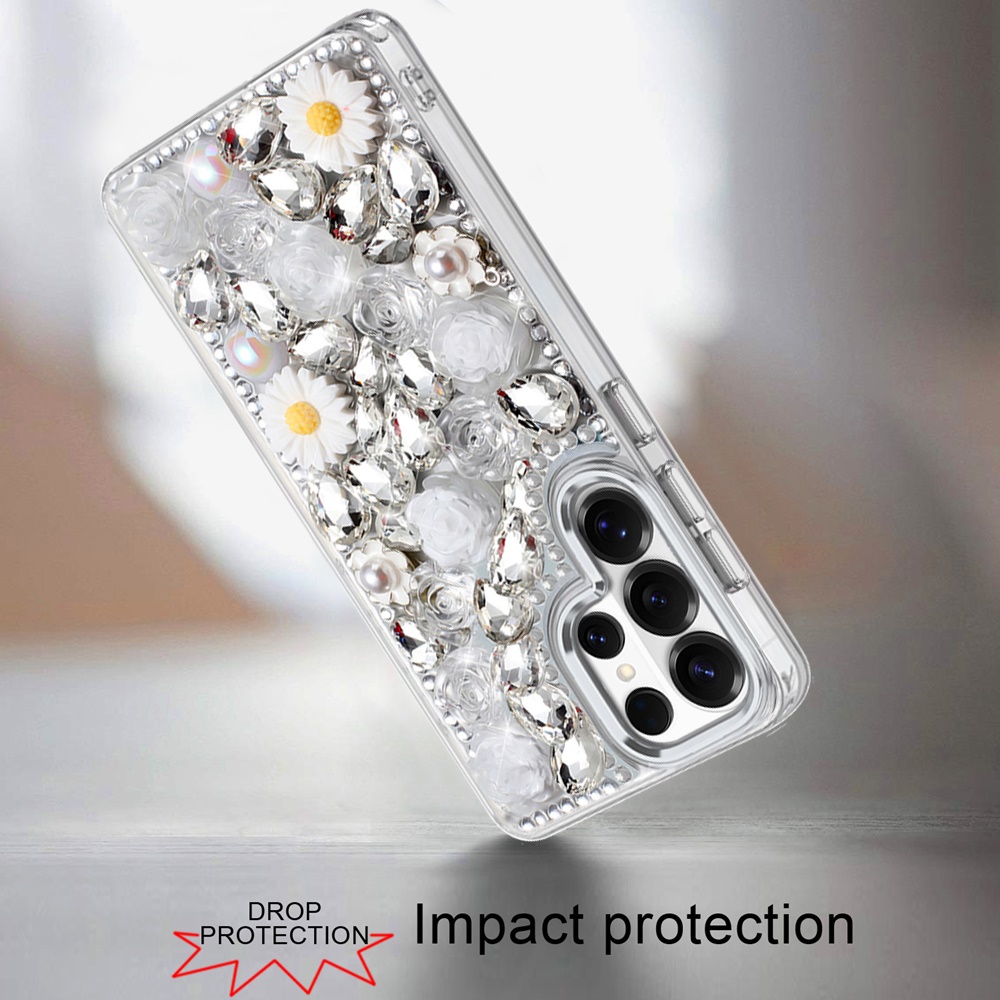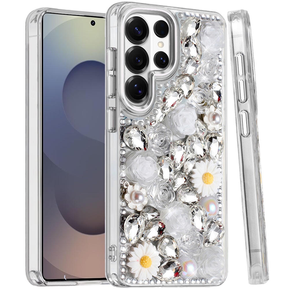 For Samsung s25 Ultra Spectacular Full Bling Stones Glitter HQ Hybrid Floral Series - White