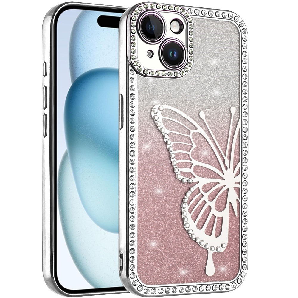For iPhone 15 Electroplated Butterfly With Diamonds Glitter Shimmer Hybrid Case - Silver