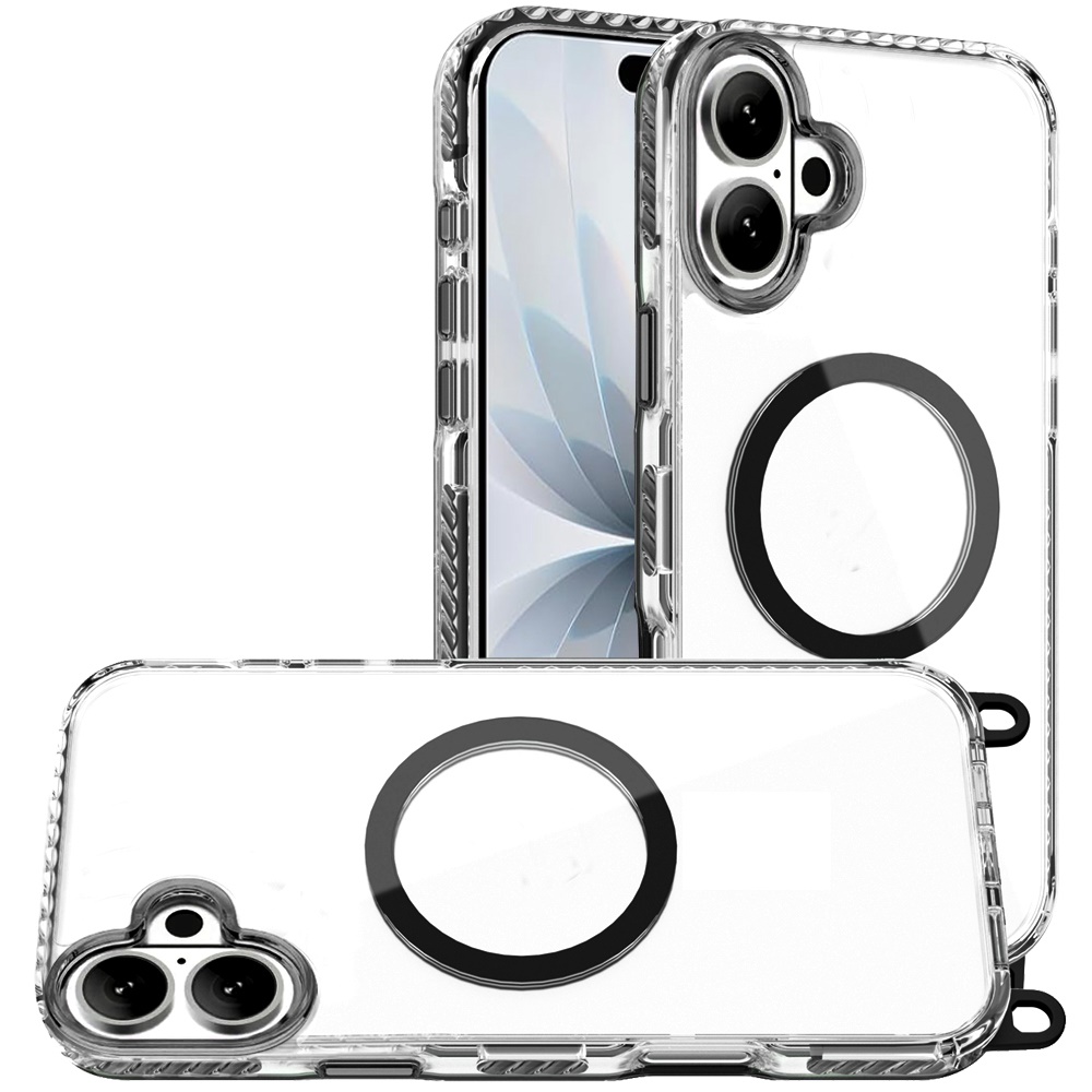 For iPhone 17 Transparent HQ Clear Line Design Edged Hybrid [Magnetic Circle] with Matching Lanyard - Black