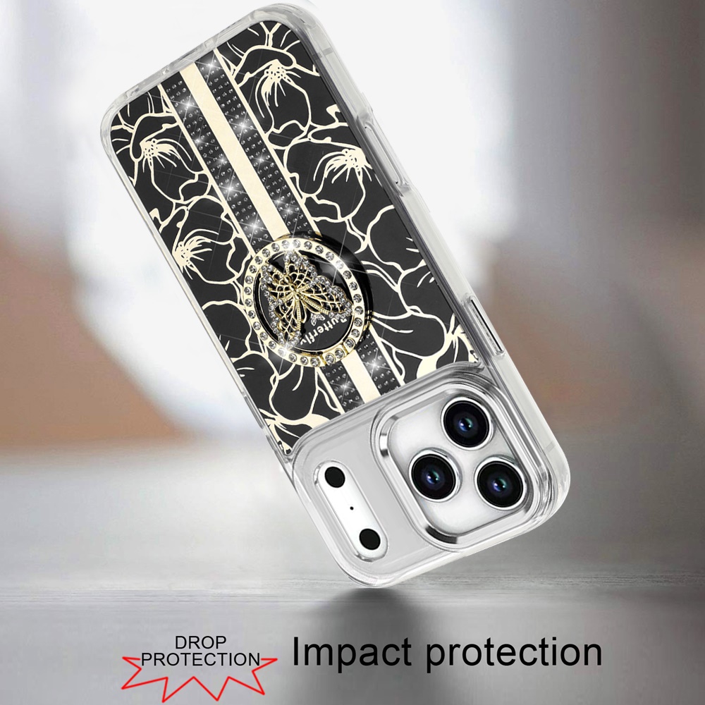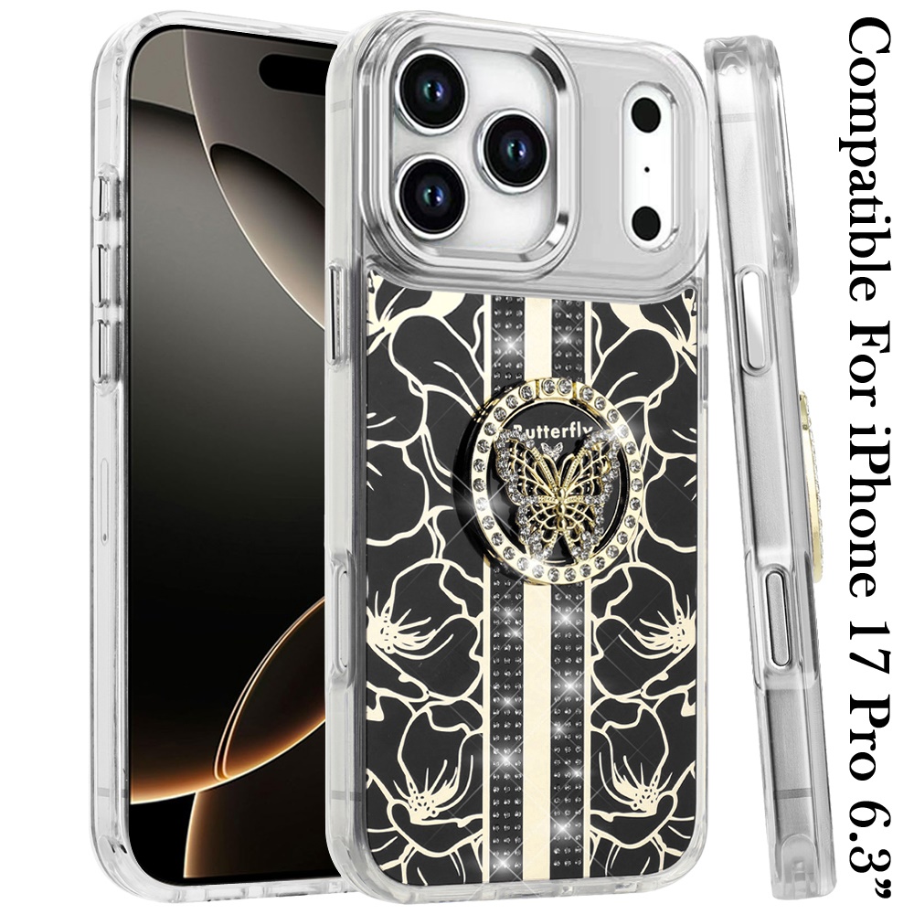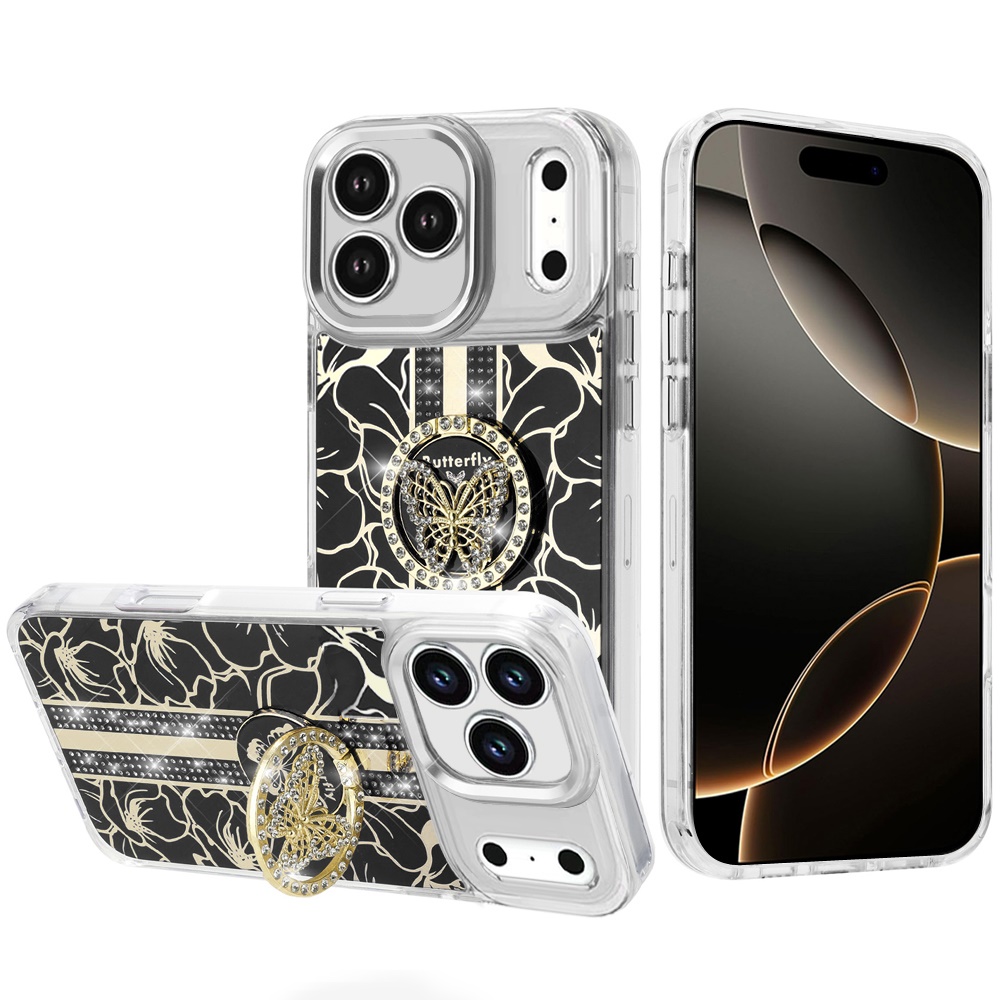 For iPhone 17 Pro Splendid Floral Designs with Metal Camera and Buttons with Butterfly Ring Stand Hybrid Case - Black