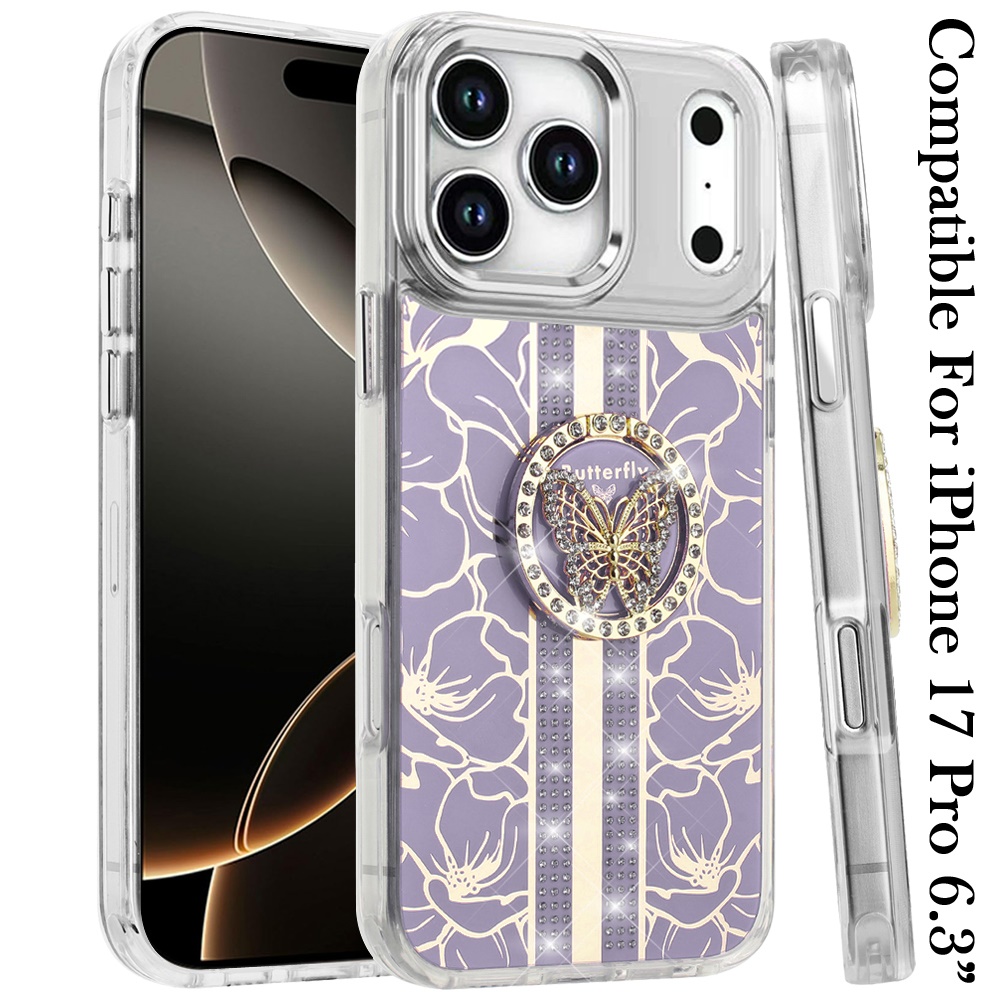 For iPhone 17 Pro Splendid Floral Designs with Metal Camera and Buttons with Butterfly Ring Stand Hybrid Case - Purple