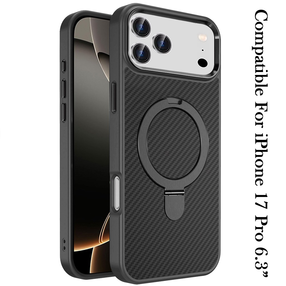 For iPhone 17 Pro Carbon Design [Magnetic Circle] with Ring Stand Hybrid Case - Black