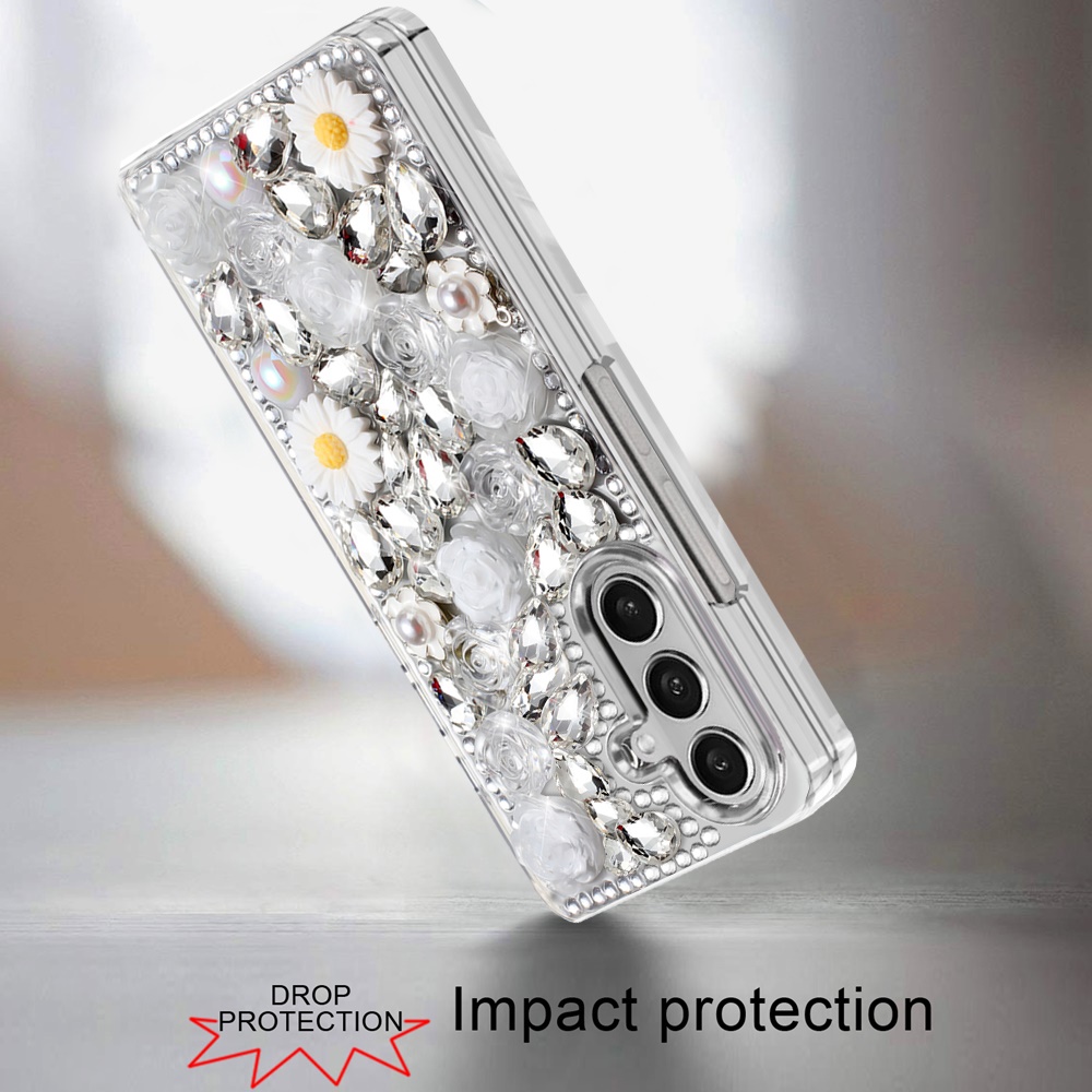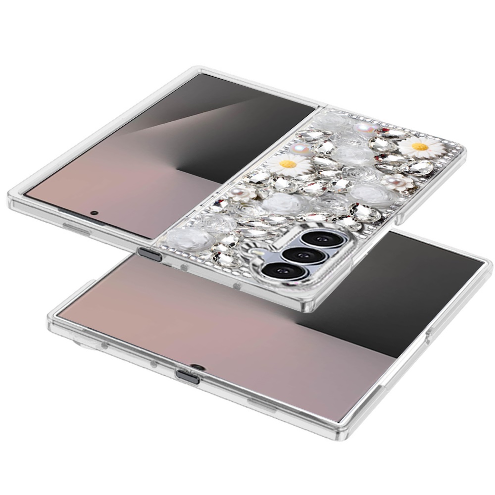 For Samsung Z Fold 7 Spectacular Full Bling Stones Glitter HQ Hybrid Floral Series - White