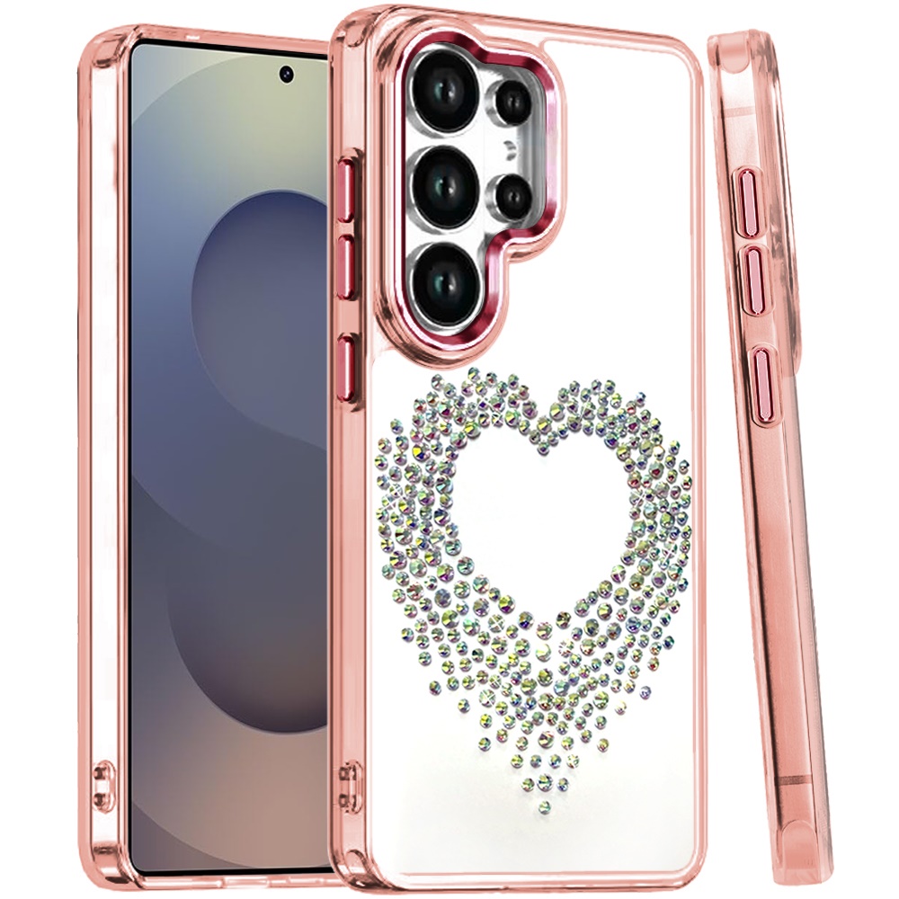 For Samsung s25 Ultra Angel Hearts Bling Shimmer Colorful Glitter Chrome Edged Hybrid Case - Rose Gold
