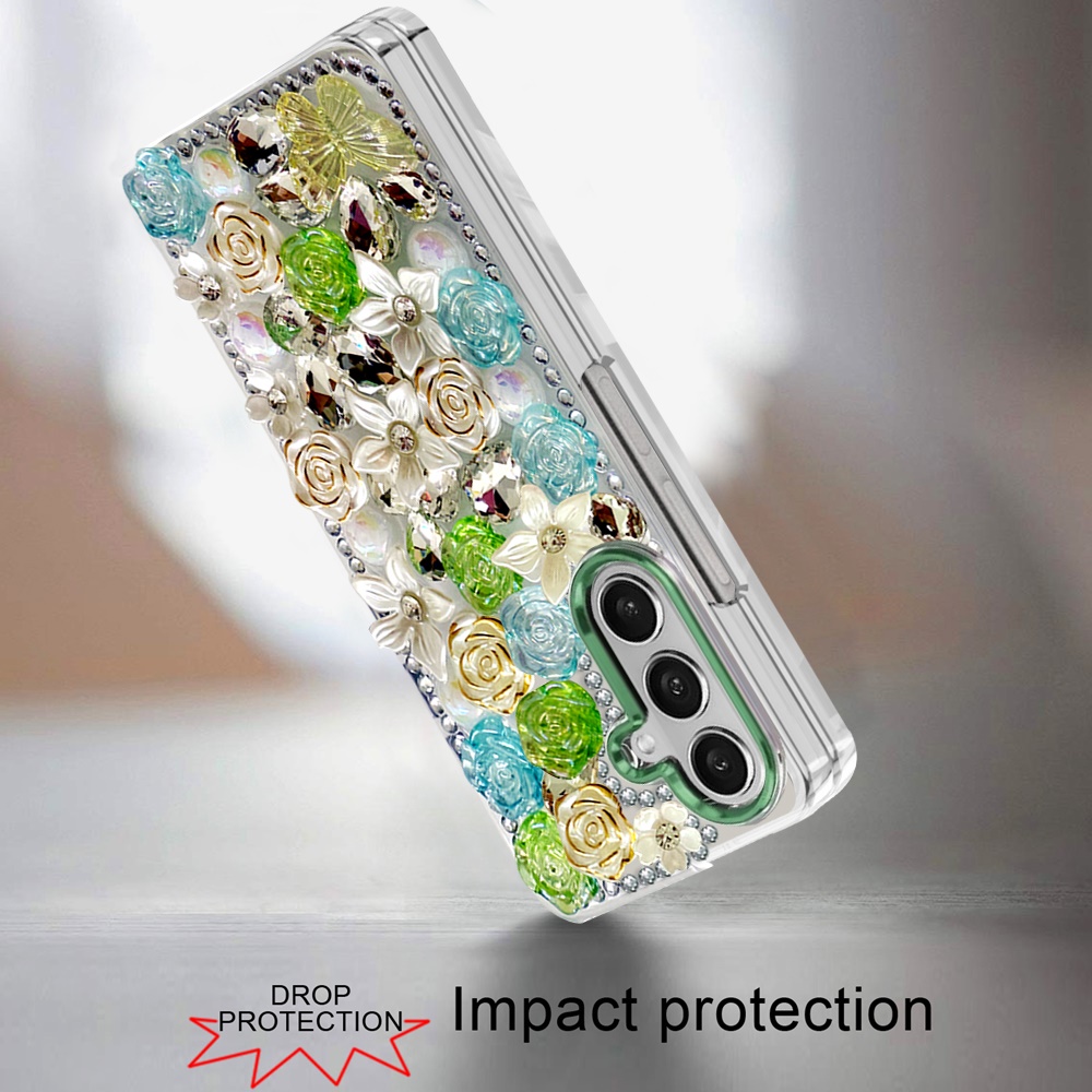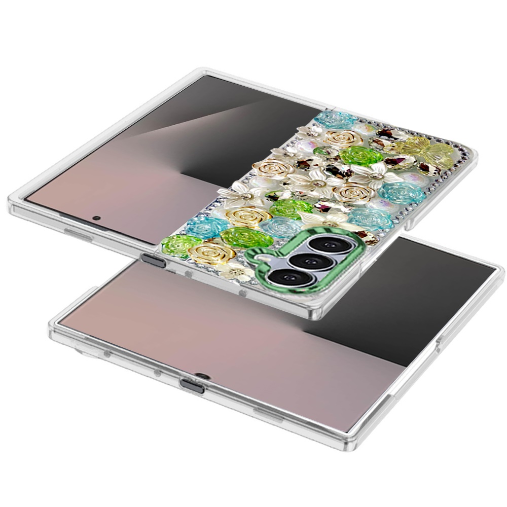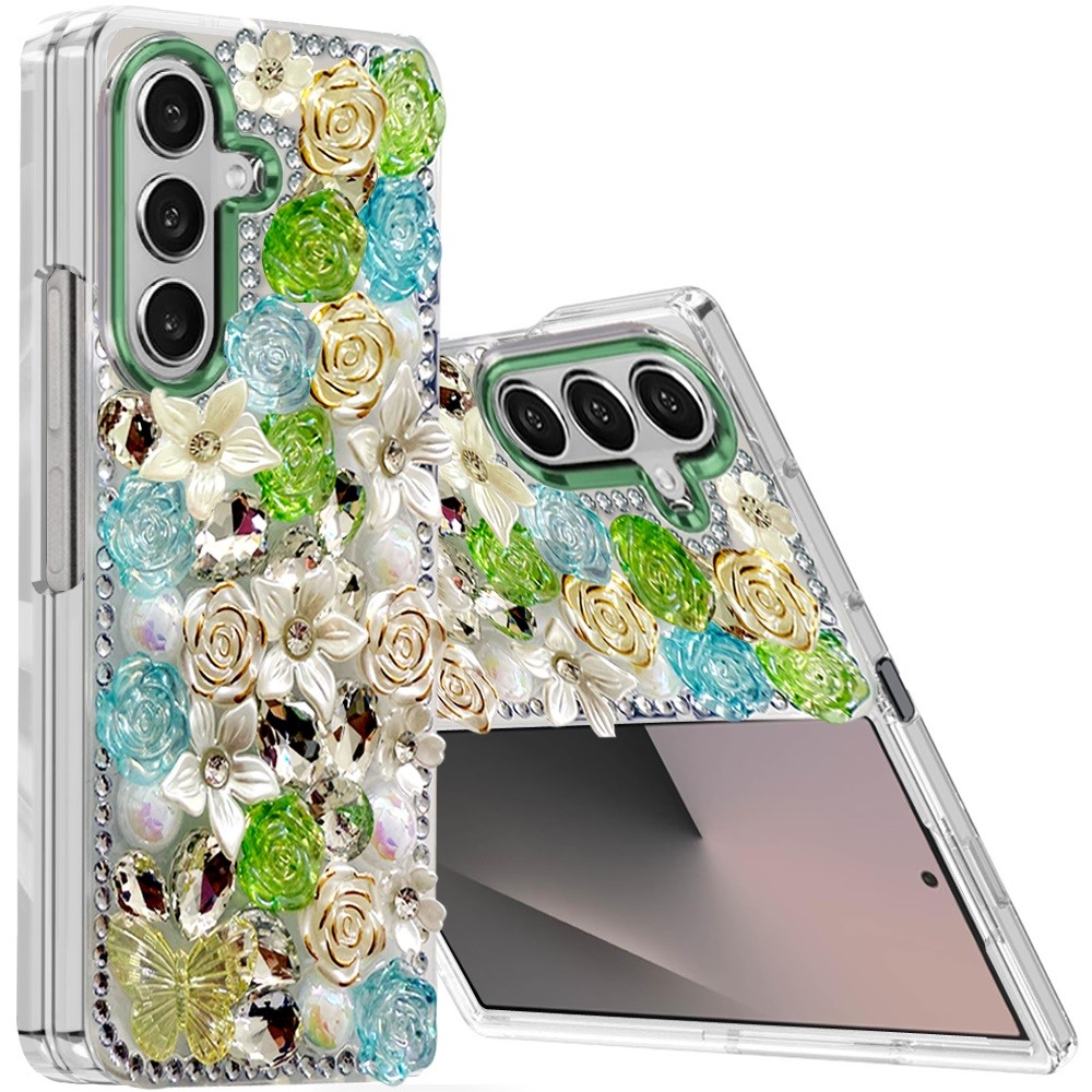 For Samsung Z Fold 7 Muti-Color Rose Bling Stones Ornaments Case - Green