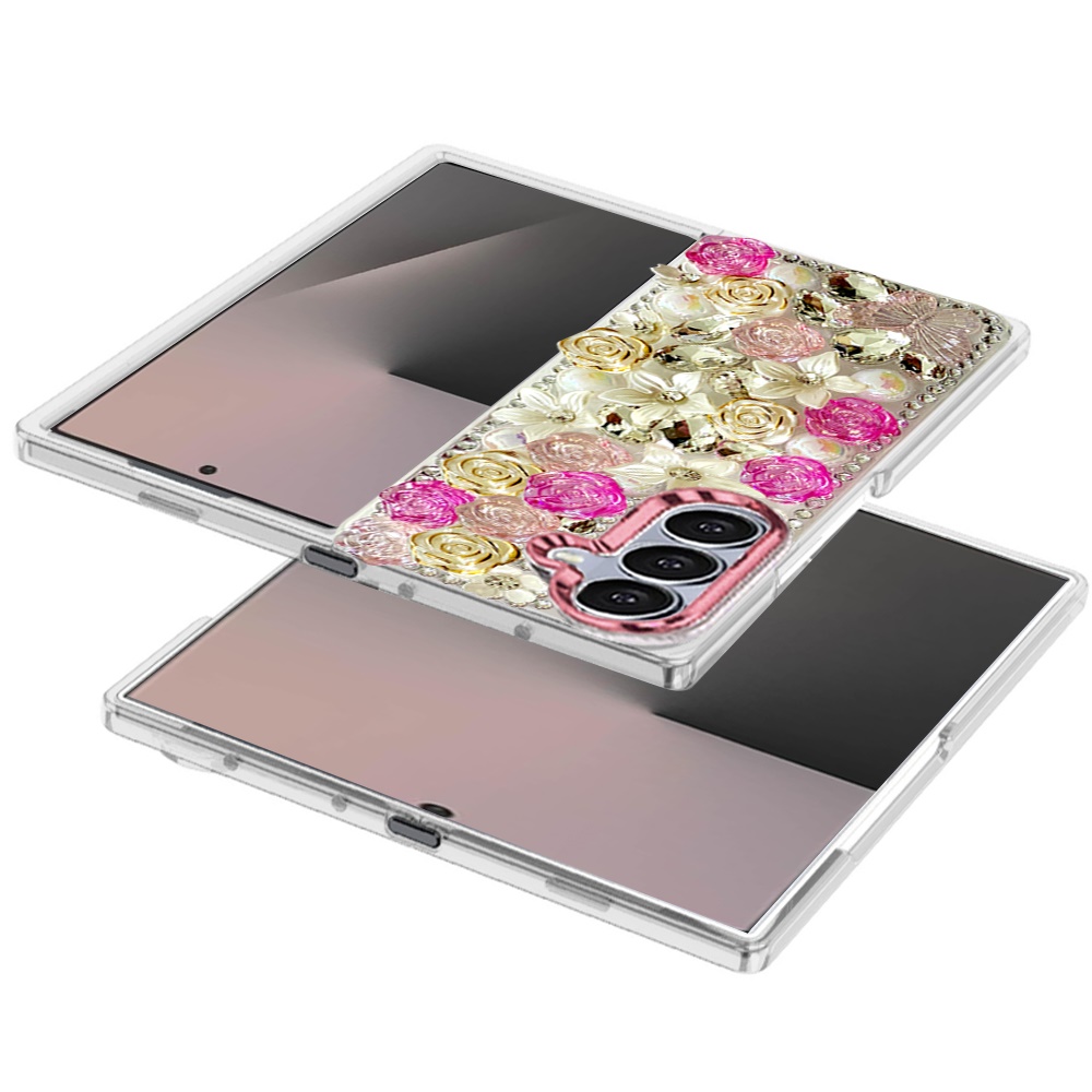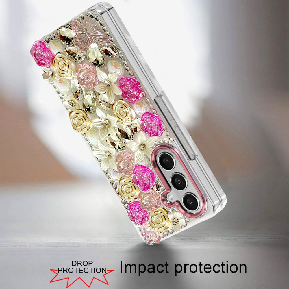 For Samsung Z Fold 7 Muti-Color Rose Bling Stones Ornaments Case - Pink