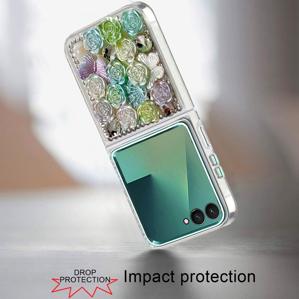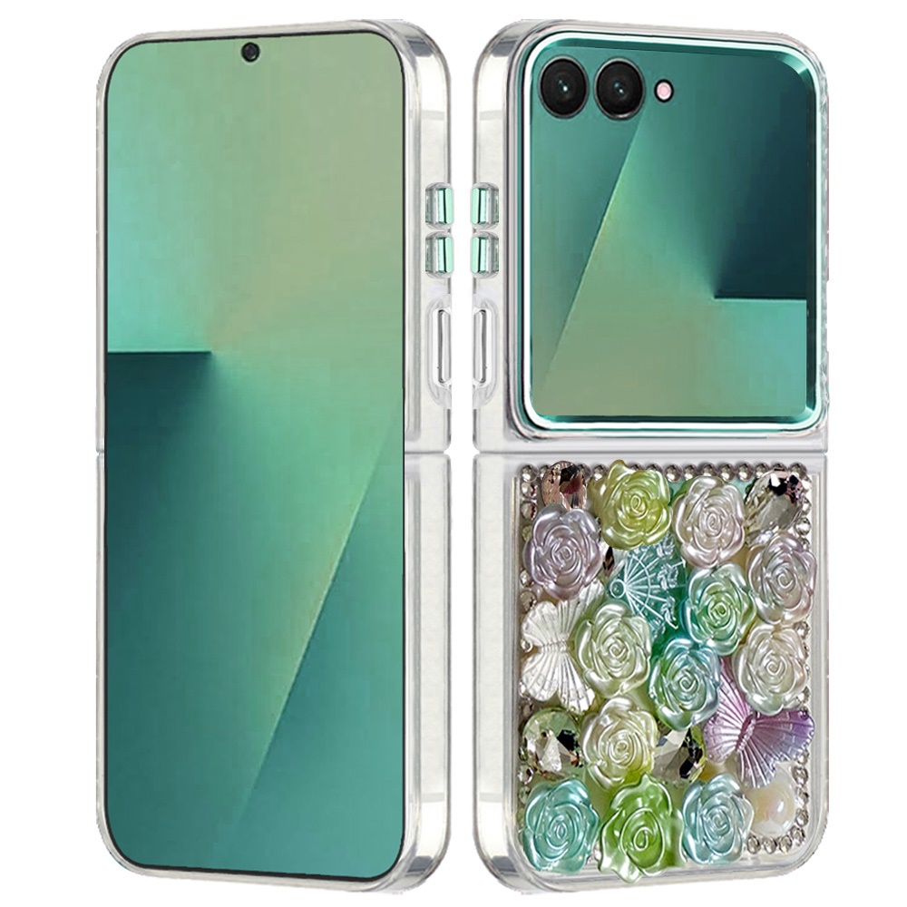 For Samsung Z Flip 7 Muti-Color Floral Bling Stones Ornaments Case - Green