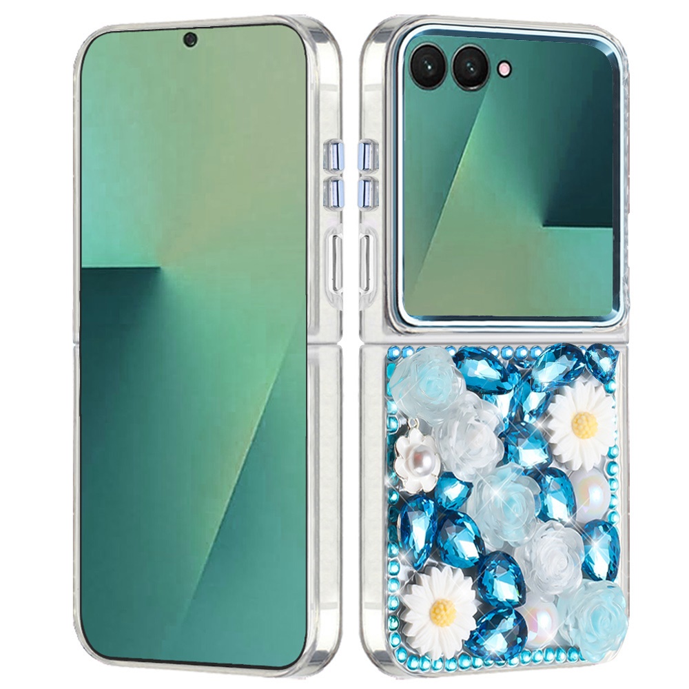 For Samsung Z Flip 7 Spectacular Full Bling Stones Glitter HQ Hybrid Floral Series - Blue