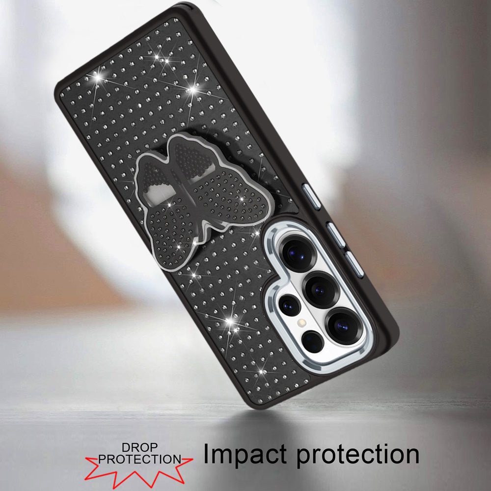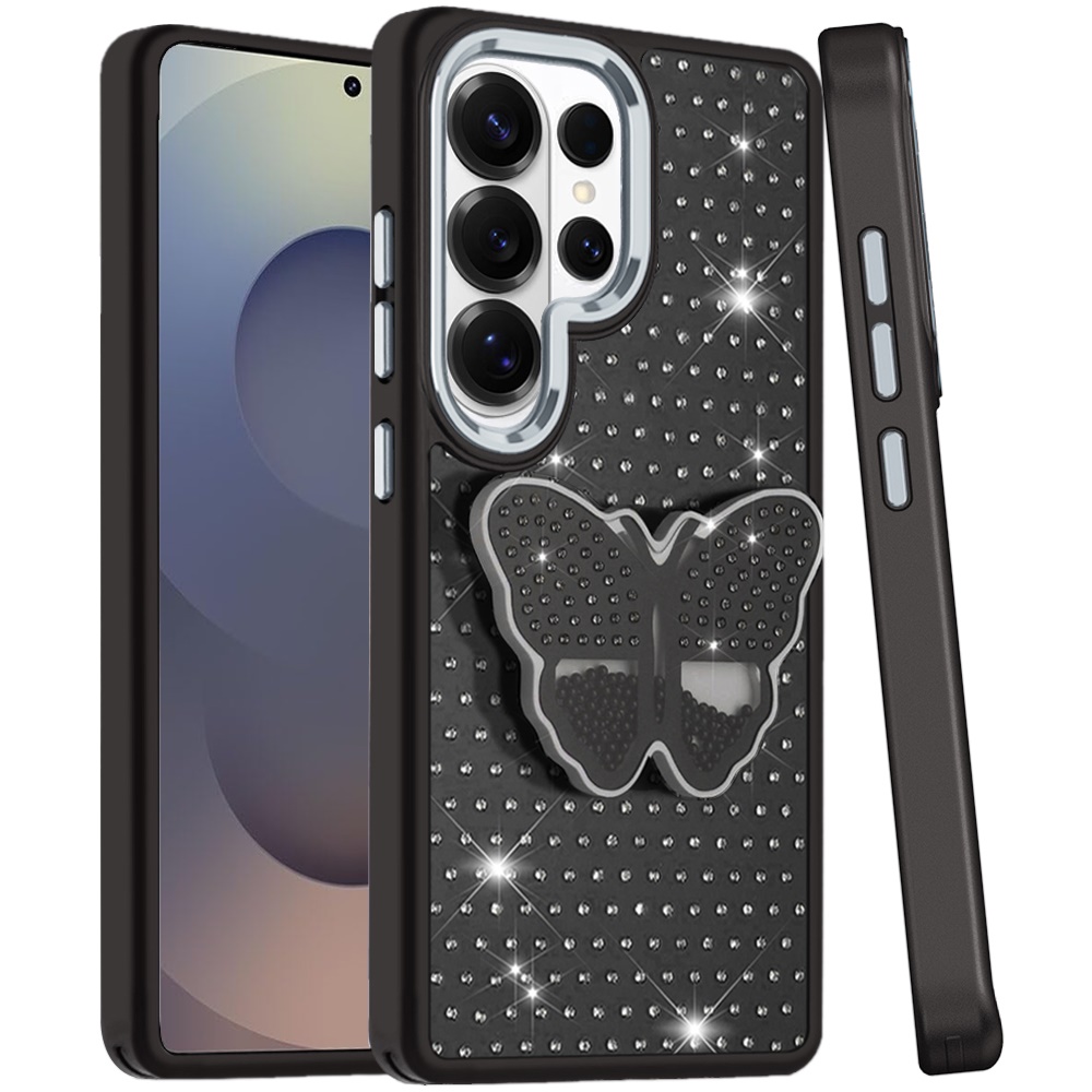 For Samsung s25 Ultra Butterfly Moveable Grip Stand With Small Diamonds Meta Buttons HQ Hybrid - Black