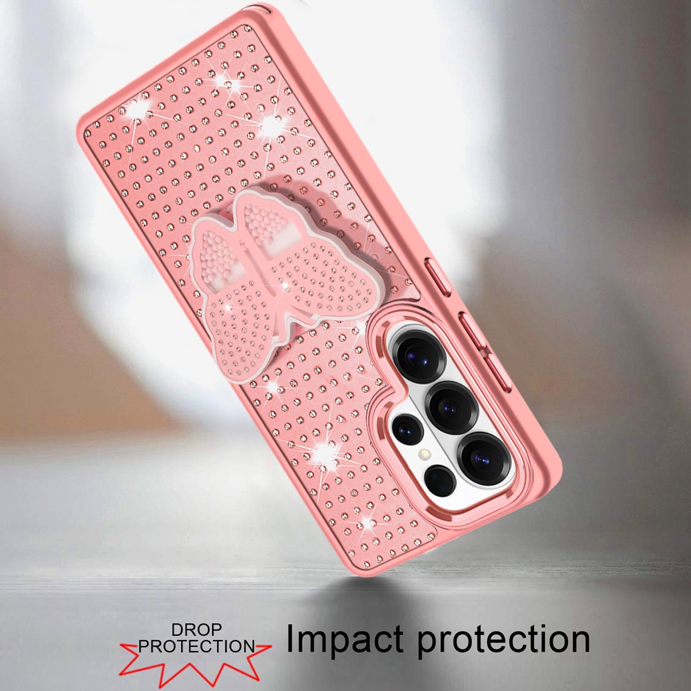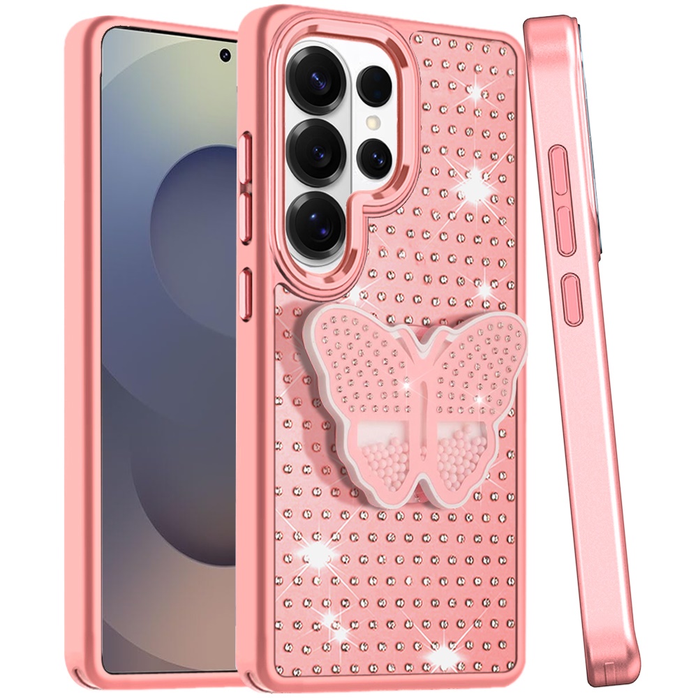 For Samsung s25 Ultra Butterfly Moveable Grip Stand With Small Diamonds Meta Buttons HQ Hybrid - Pink