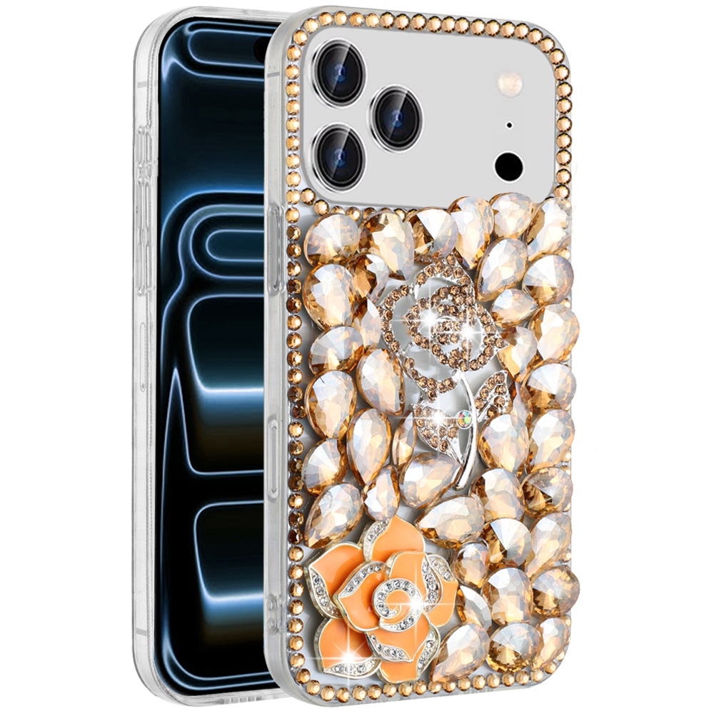 For iPhone 17 Pro Max Floral Full Diamond Bling Case Cover - Gold