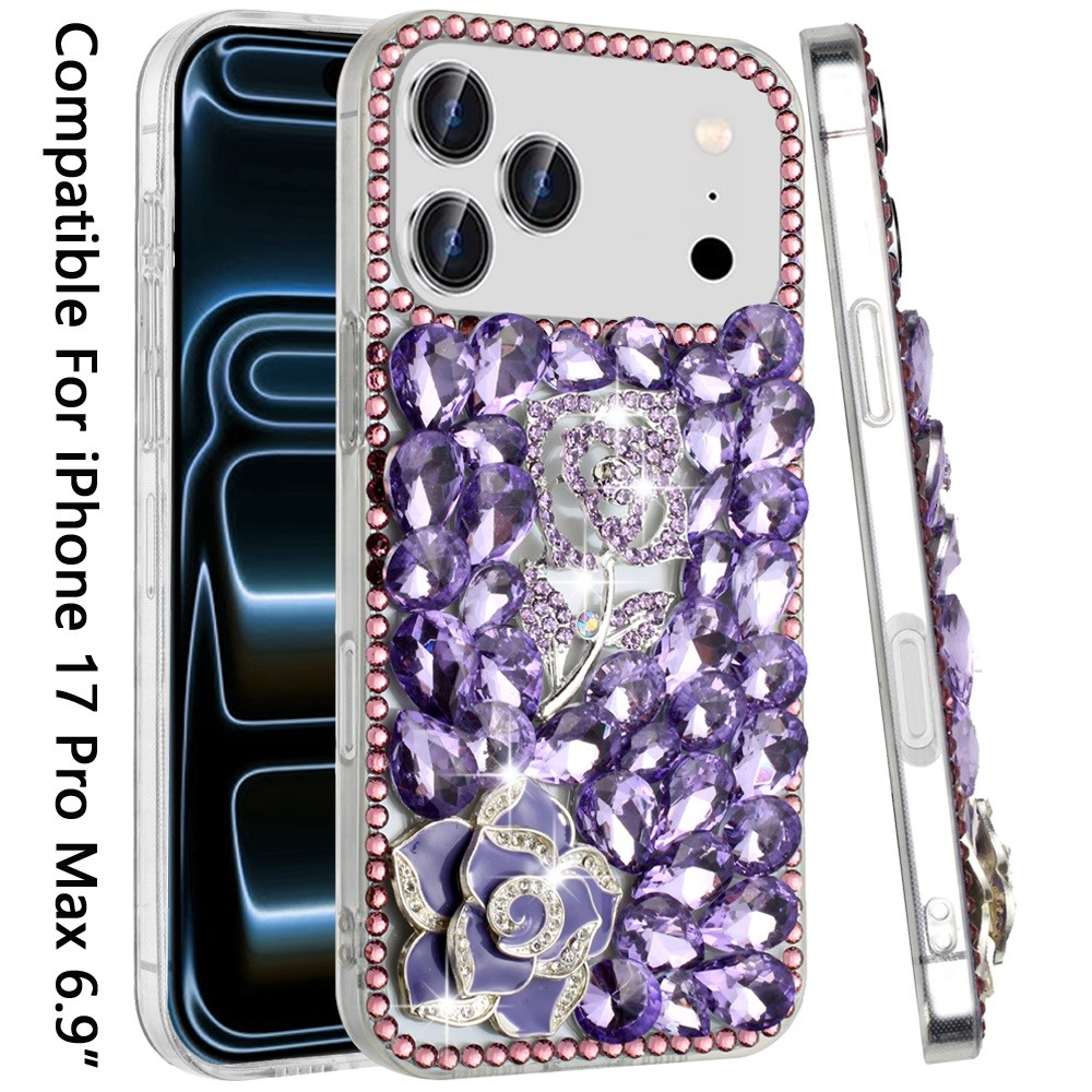For iPhone 17 Pro Max Floral Full Diamond Bling Case Cover - Purple