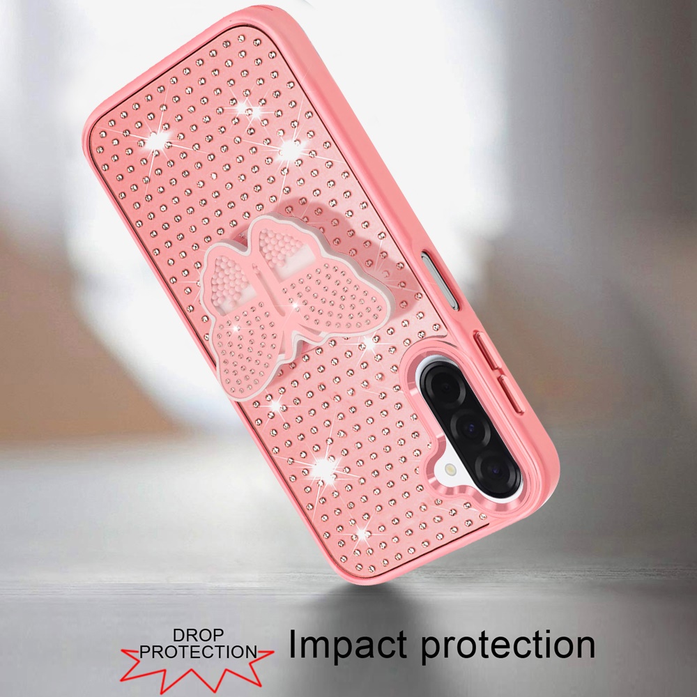 For Samsung A17 5G Butterfly Moveable Grip Stand With Small Diamonds Meta Buttons HQ Hybrid - Pink
