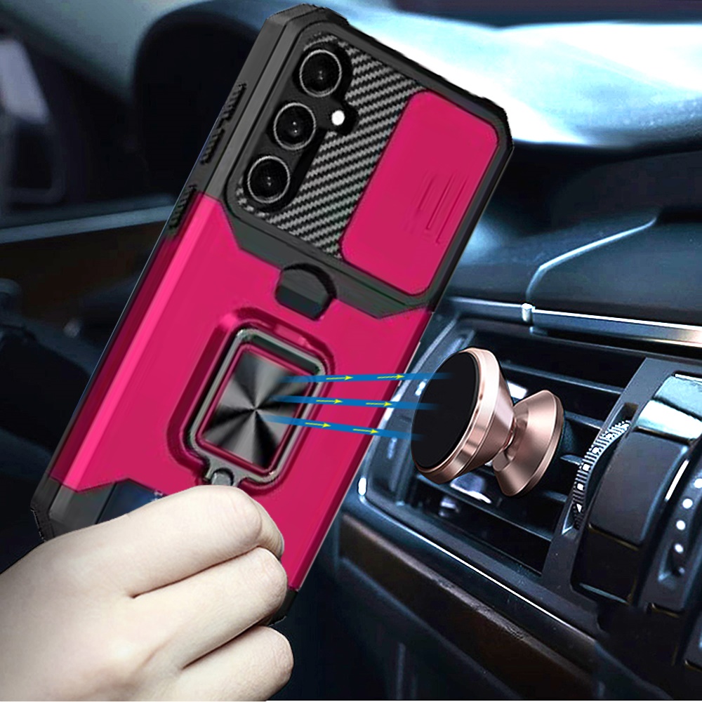 For Samsung s25 FE Multi-Functional Card Magnetic Ring Stand Hybrid Camera Case Cover - Hot Pink