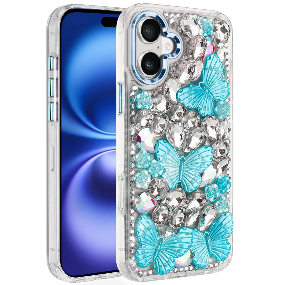 For iPhone 17 Lavished Floral Butterfly Bling Stones Hybrid Case - Blue