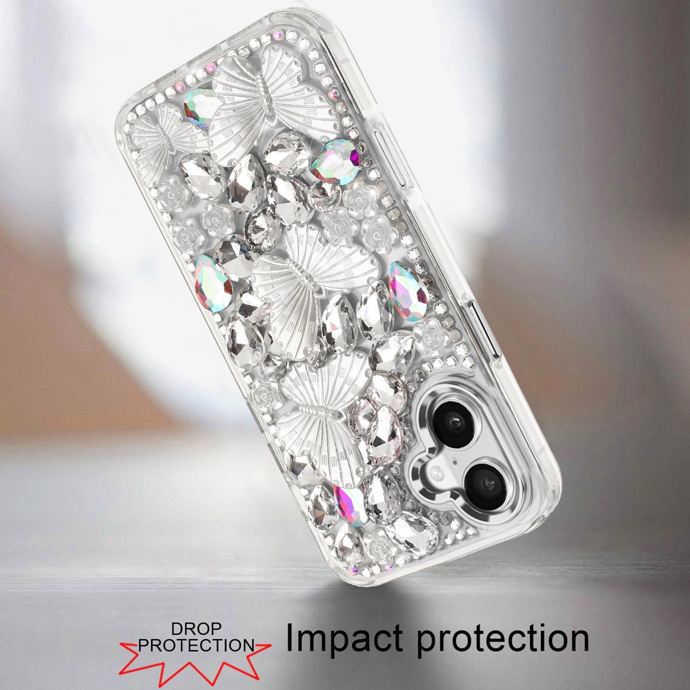 For iPhone 17 Lavished Floral Butterfly Bling Stones Hybrid Case - Silver