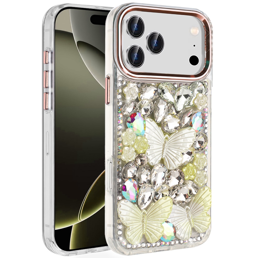 For iPhone 17 Pro Lavished Floral Butterfly Bling Stones Hybrid Case - Rose Gold