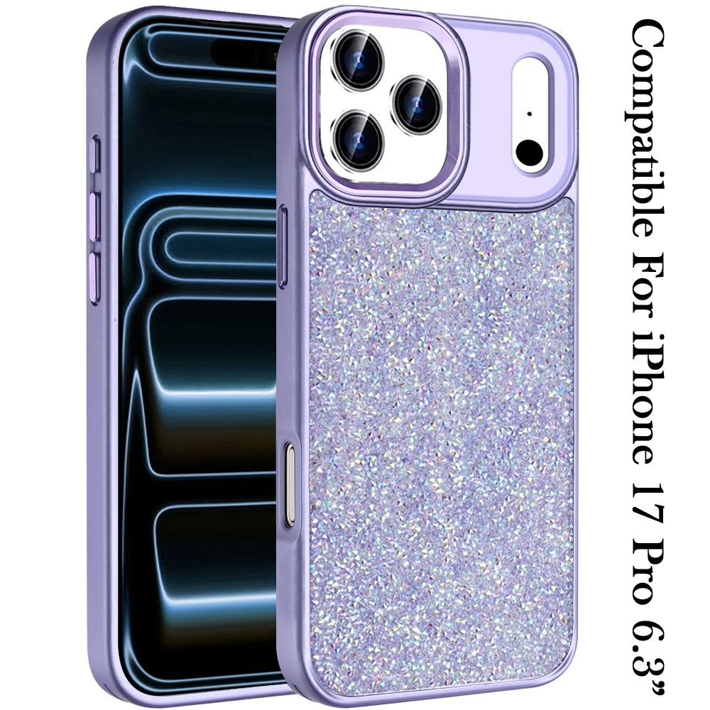 For iPhone 17 Pro Crystal Glass Diamond with Metallic Buttons and Edges Hybrid Case - Dark Purple