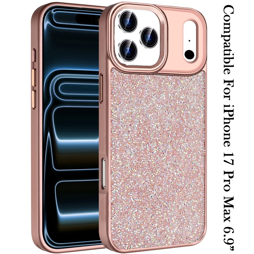 For iPhone 17 Pro Max Crystal Glass Diamond with Metallic Buttons and Edges Hybrid Case - Rose Gold