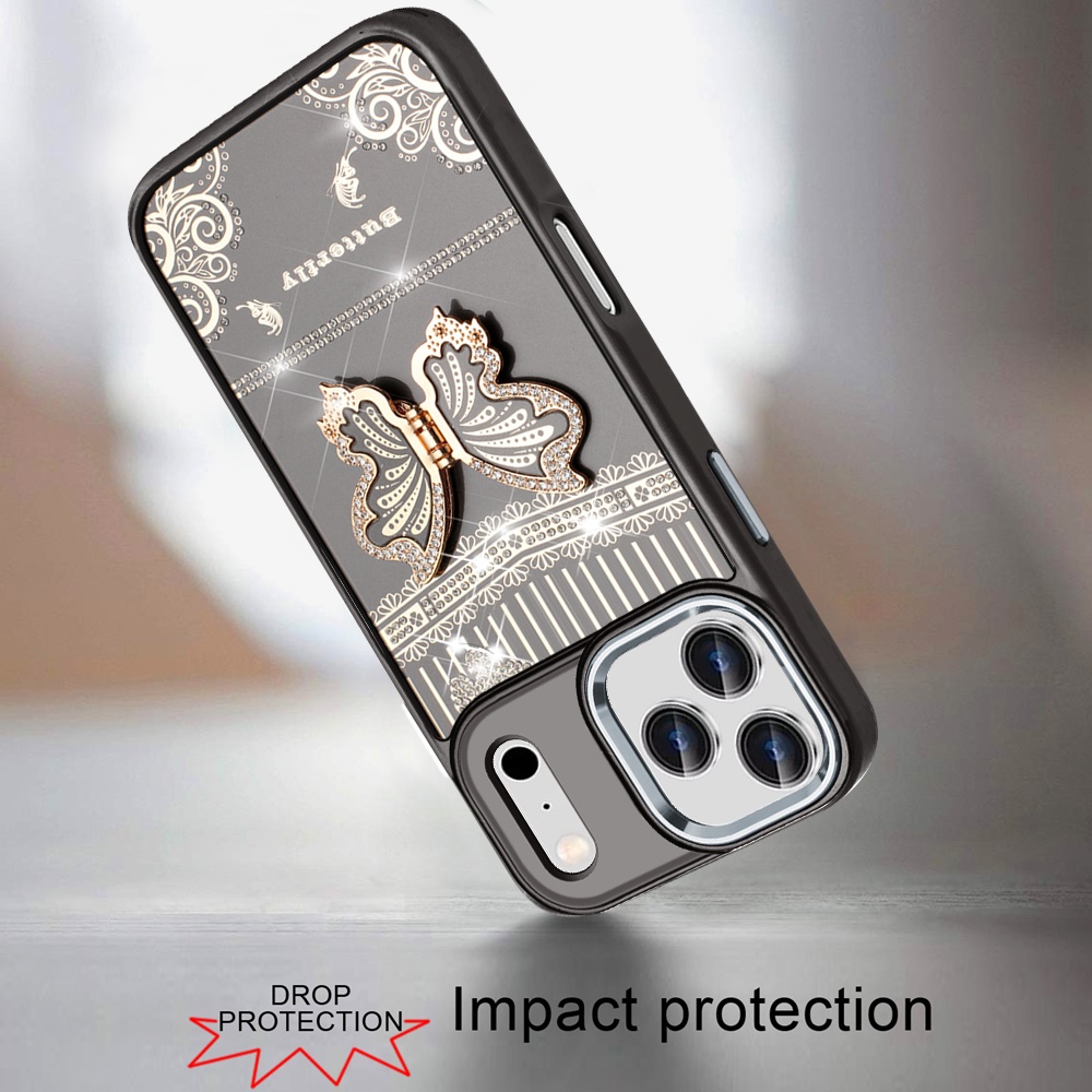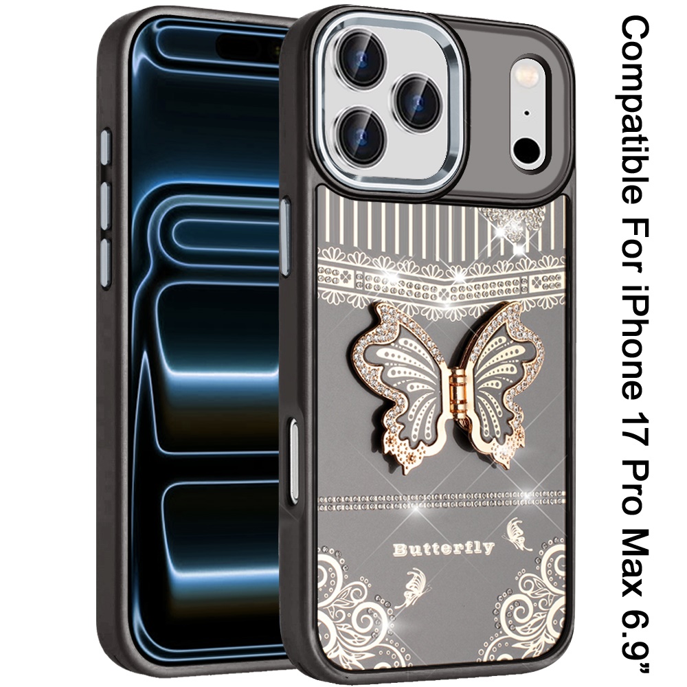 For iPhone 17 Pro Max Splendid Glitter Butterfly Design Stand with Metallic Edges Hybrid Case - Black
