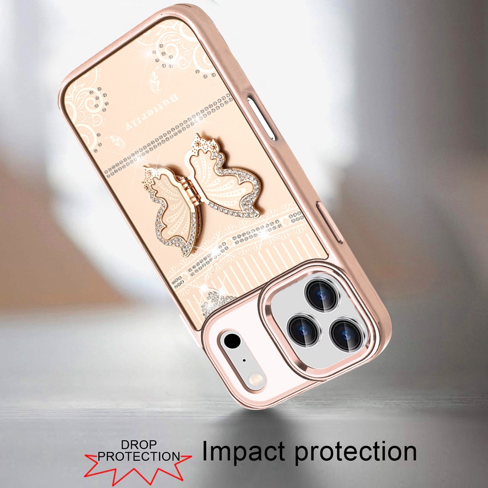 For iPhone 17 Pro Max Splendid Glitter Butterfly Design Stand with Metallic Edges Hybrid Case - Gold
