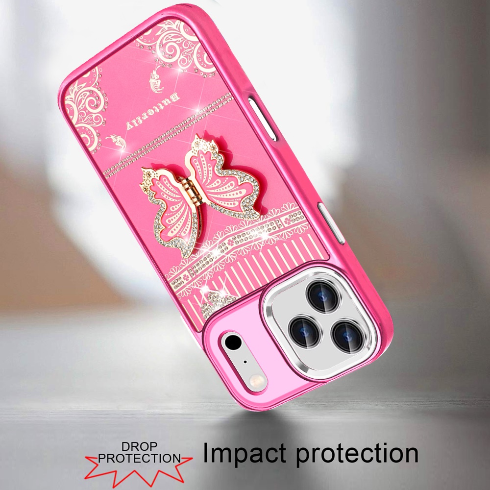 For iPhone 17 Pro Max Splendid Glitter Butterfly Design Stand with Metallic Edges Hybrid Case - Hot Pink