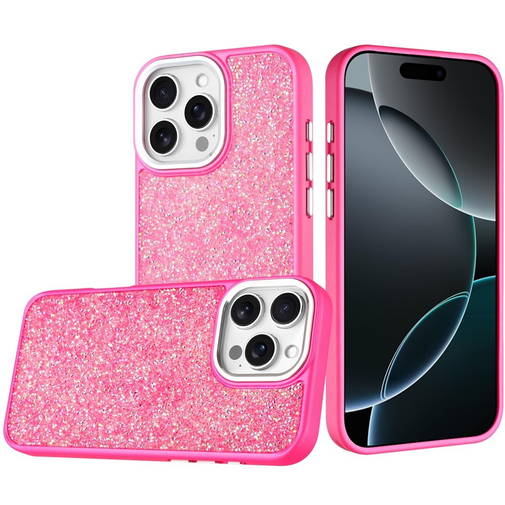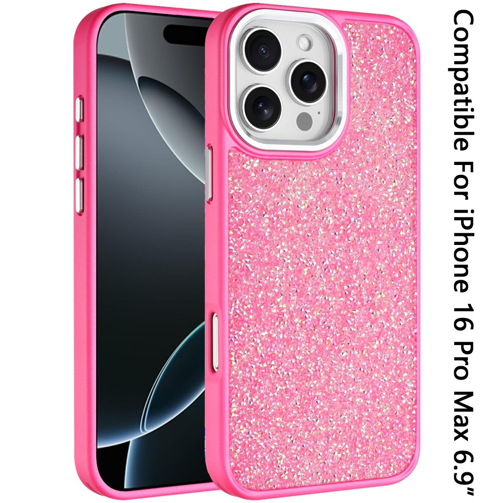 For iPhone 16 Pro Max 6.9 Crystal Glass Diamond with Metallic Buttons and Edges Hybrid Case - Hot Pink