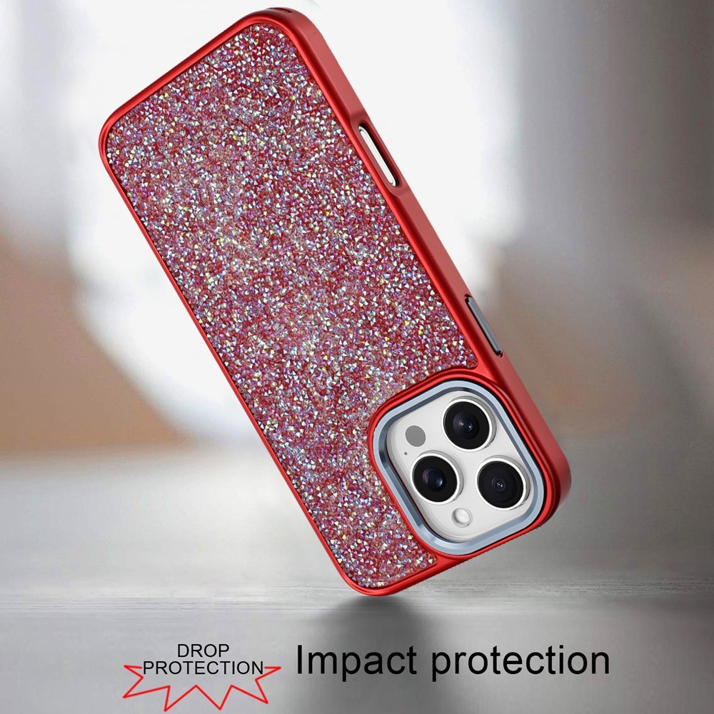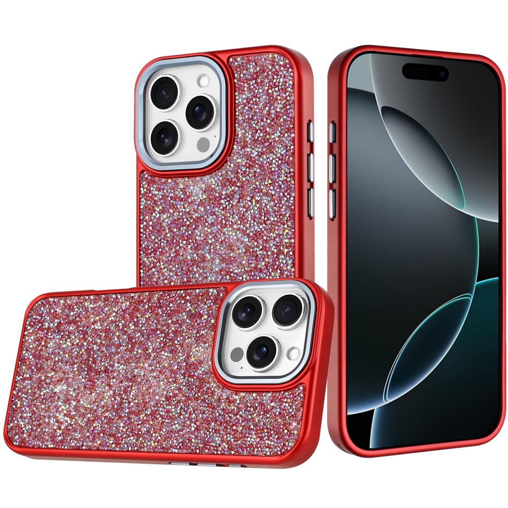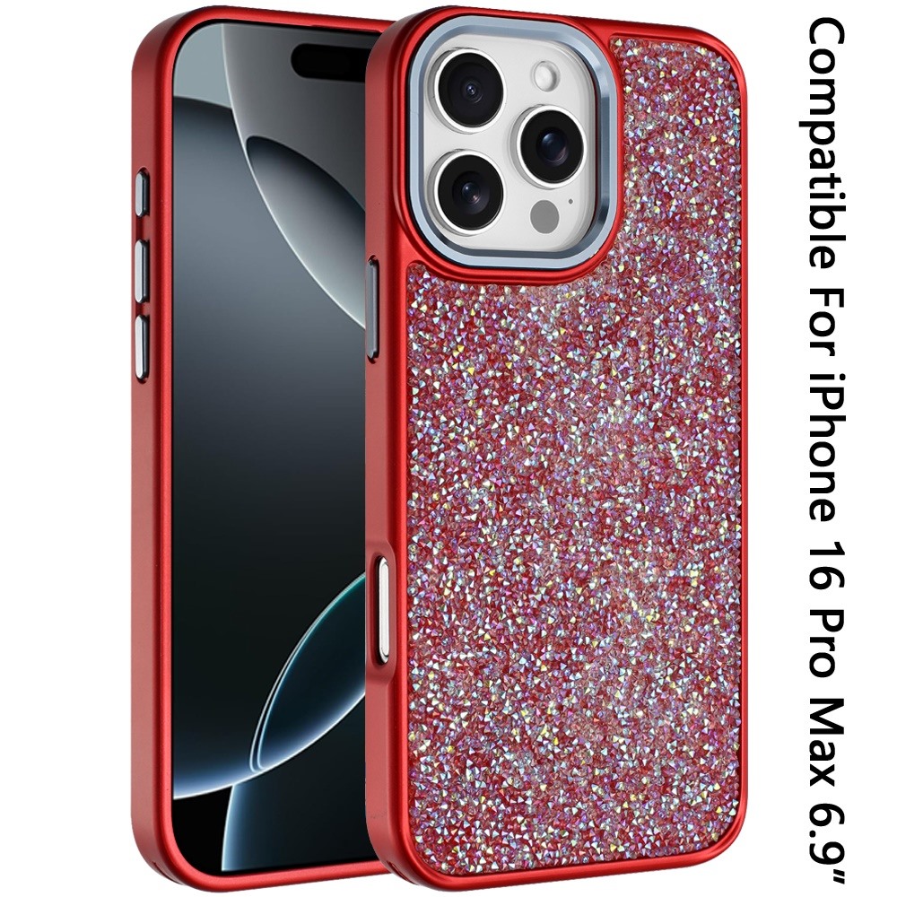 For iPhone 16 Pro Max 6.9 Crystal Glass Diamond with Metallic Buttons and Edges Hybrid Case - Red