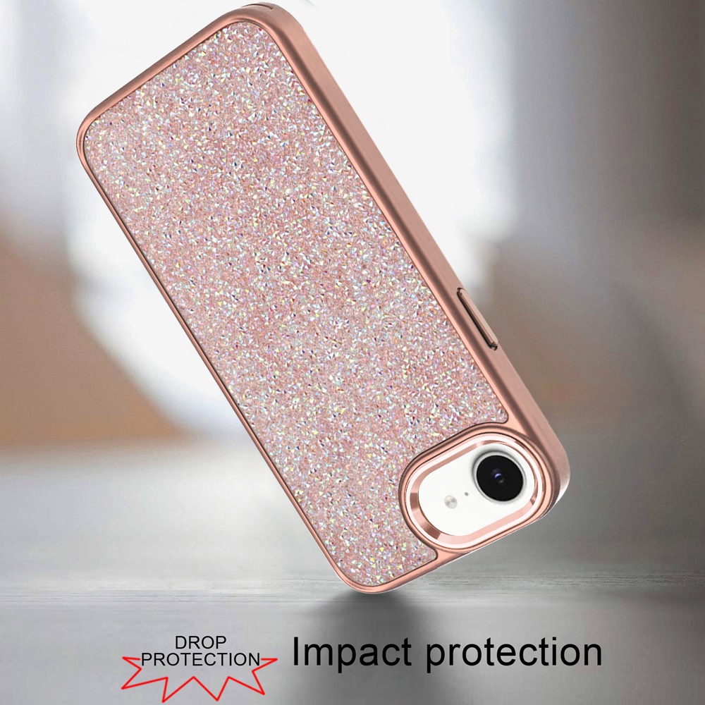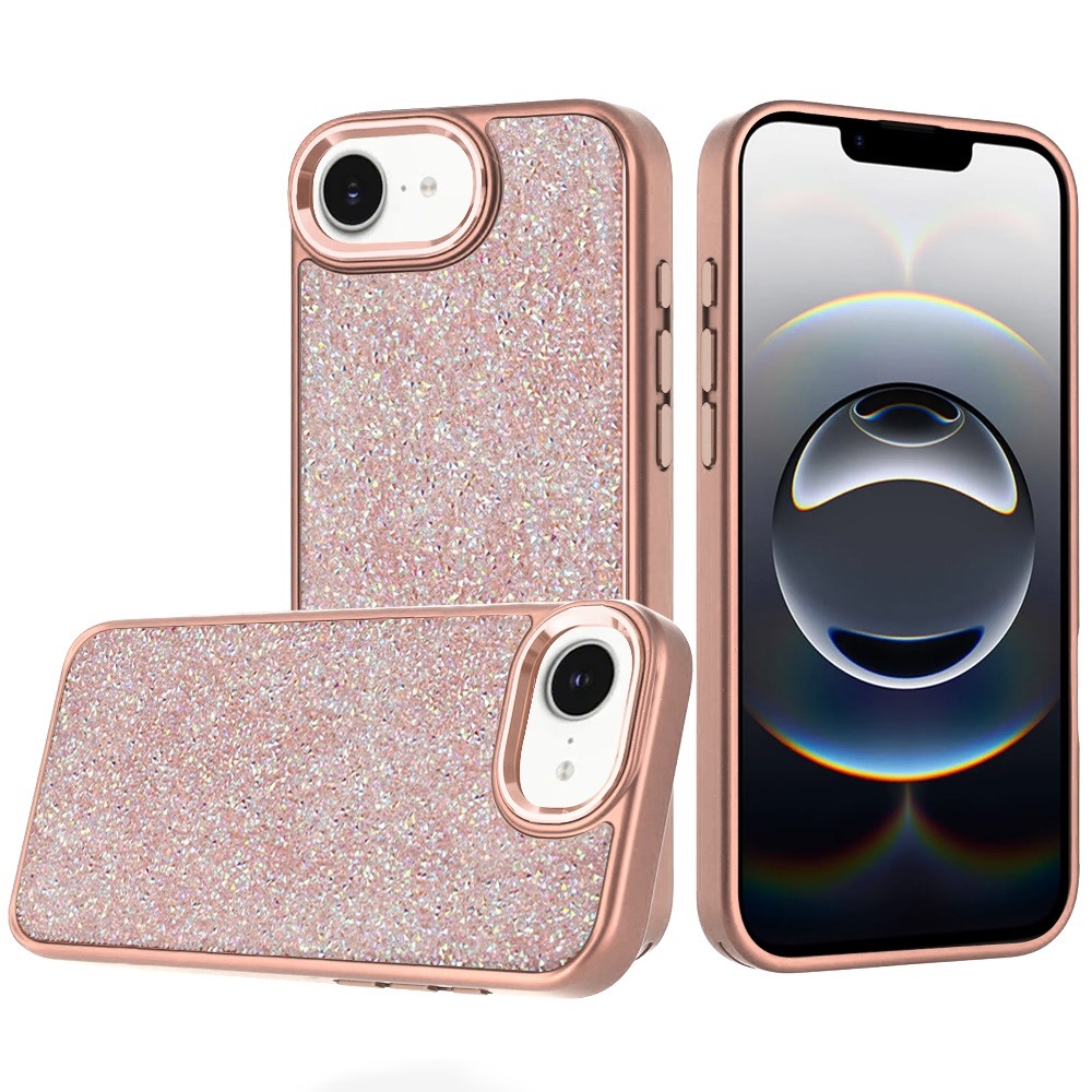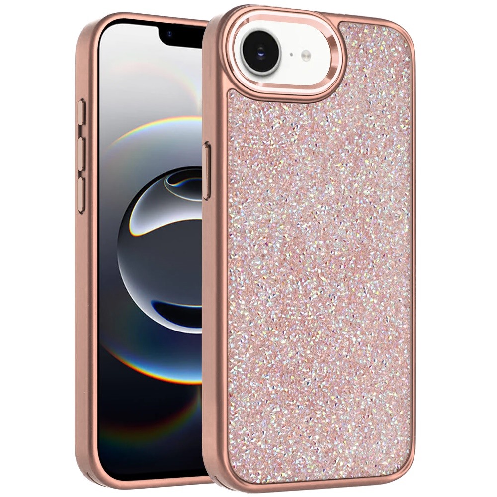 For iPhone 16E (E edition) / SE4 (2025) Crystal Glass Diamond with Metallic Buttons and Edges Hybrid Case - Rose Gold