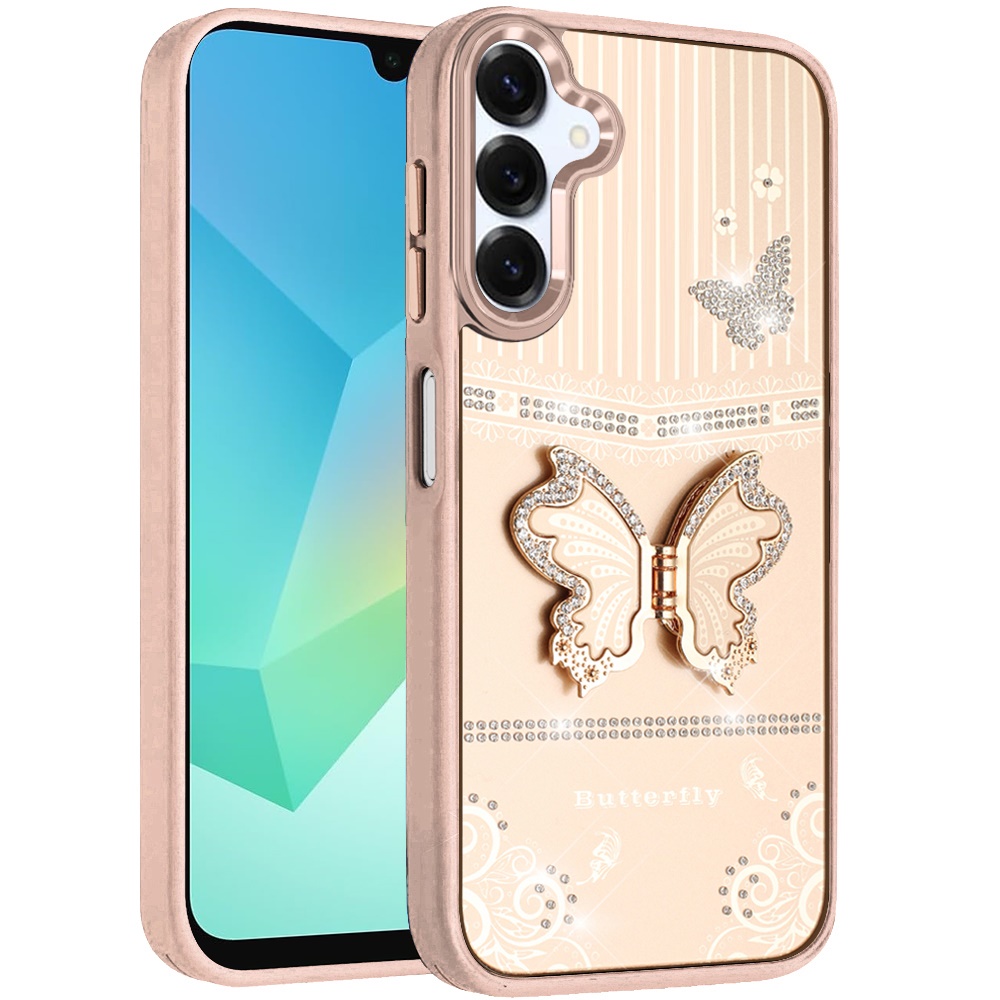 For Samsung A16 5G Splendid Glitter Butterfly Design Stand with Metallic Edges Hybrid Case - Gold