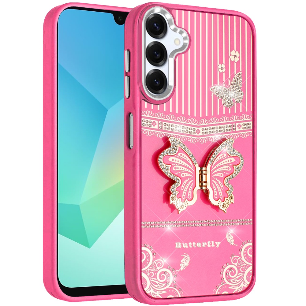 For Samsung A16 5G Splendid Glitter Butterfly Design Stand with Metallic Edges Hybrid Case - Hot Pink