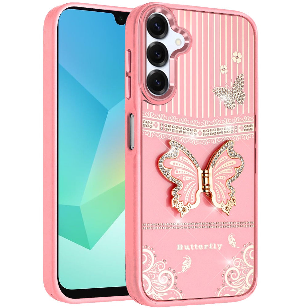 For Samsung A16 5G Splendid Glitter Butterfly Design Stand with Metallic Edges Hybrid Case - Light Pink