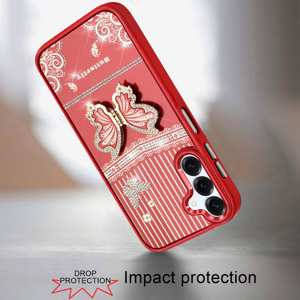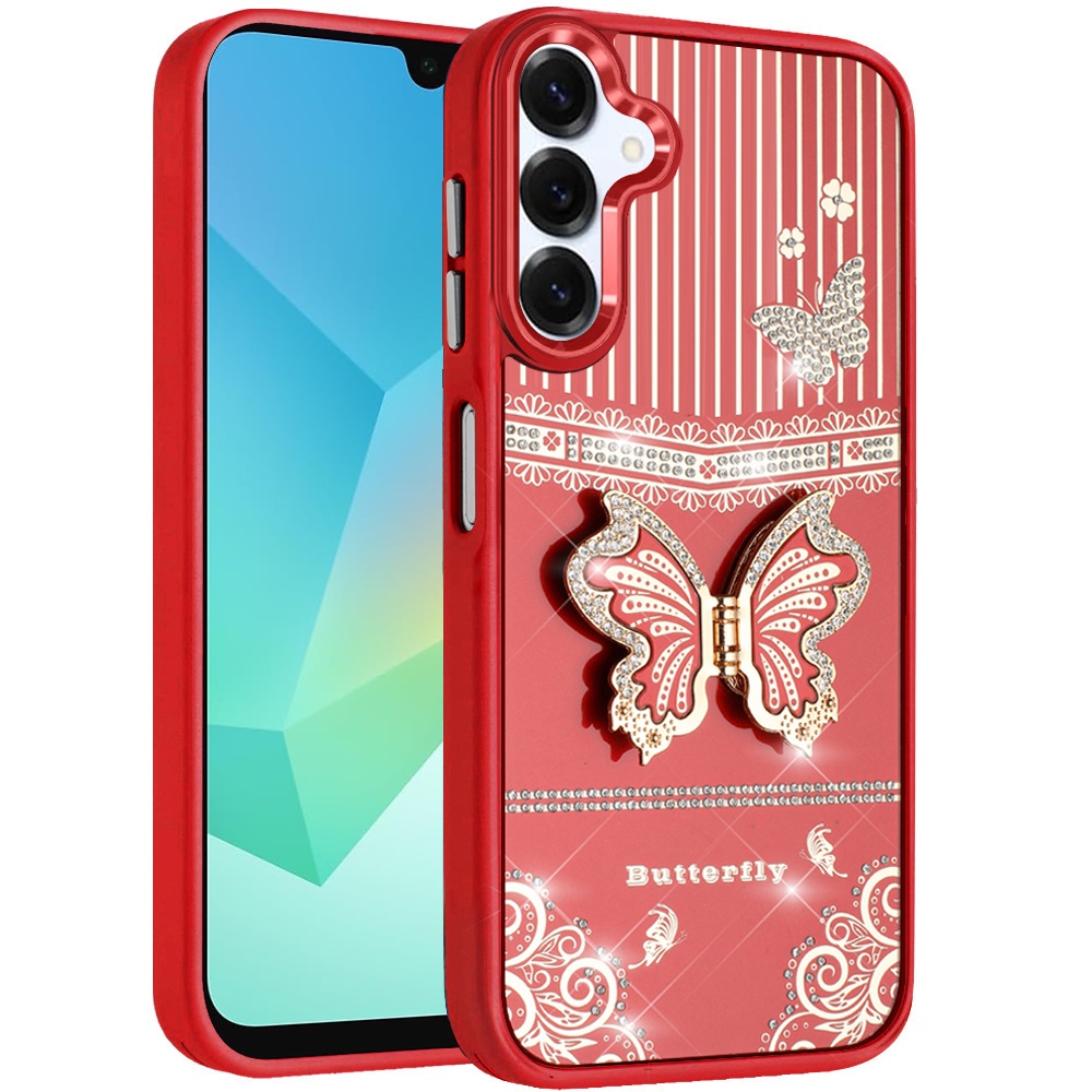 For Samsung A16 5G Splendid Glitter Butterfly Design Stand with Metallic Edges Hybrid Case - Red