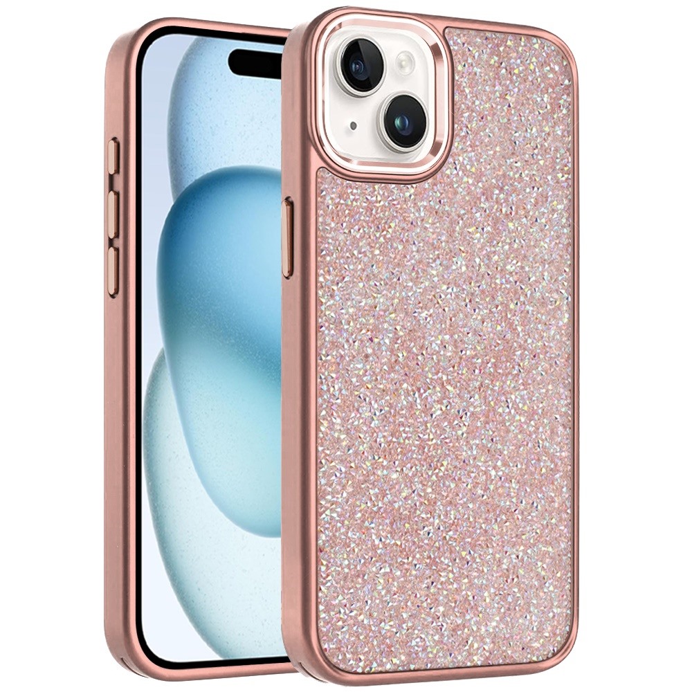 For iPhone 15 Crystal Glass Diamond with Metallic Buttons and Edges Hybrid Case - Rose Gold