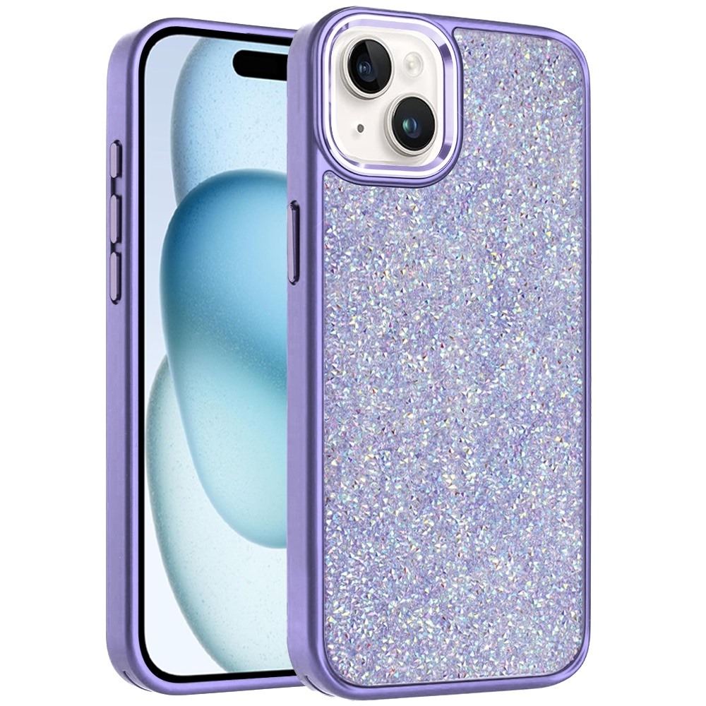 For iPhone 15 Crystal Glass Diamond with Metallic Buttons and Edges Hybrid Case - Dark Purple