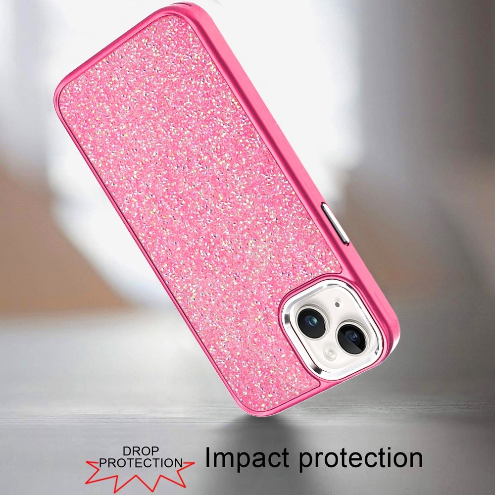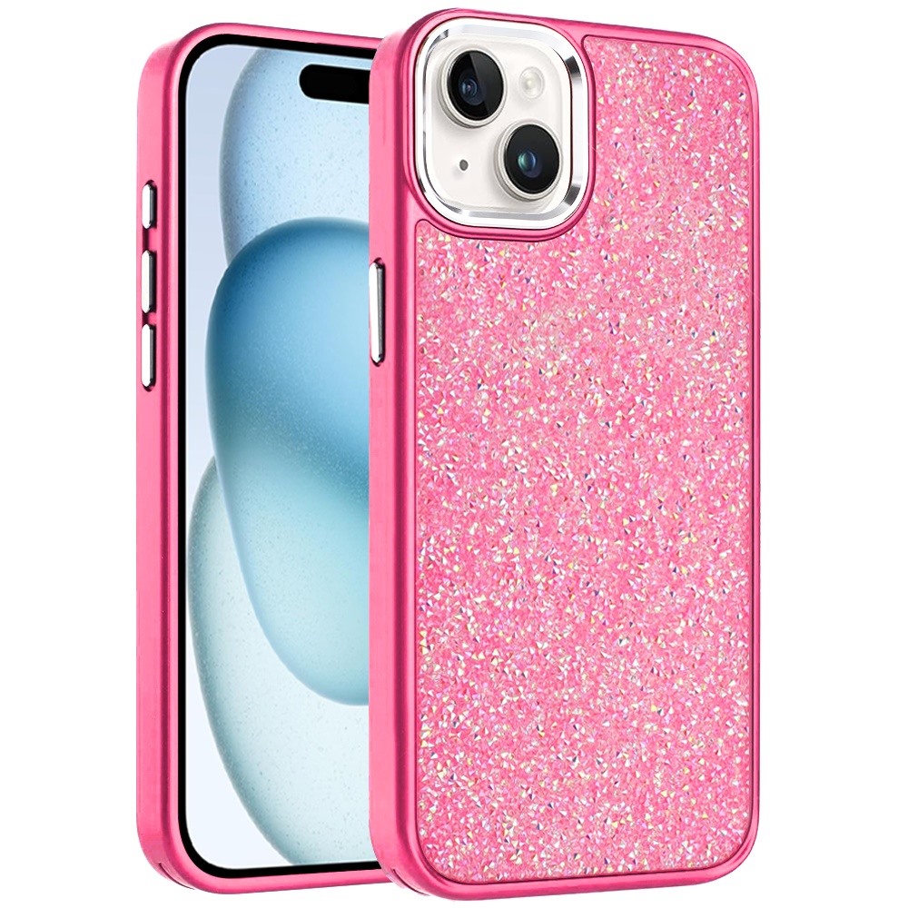 For iPhone 15 Crystal Glass Diamond with Metallic Buttons and Edges Hybrid Case - Hot Pink