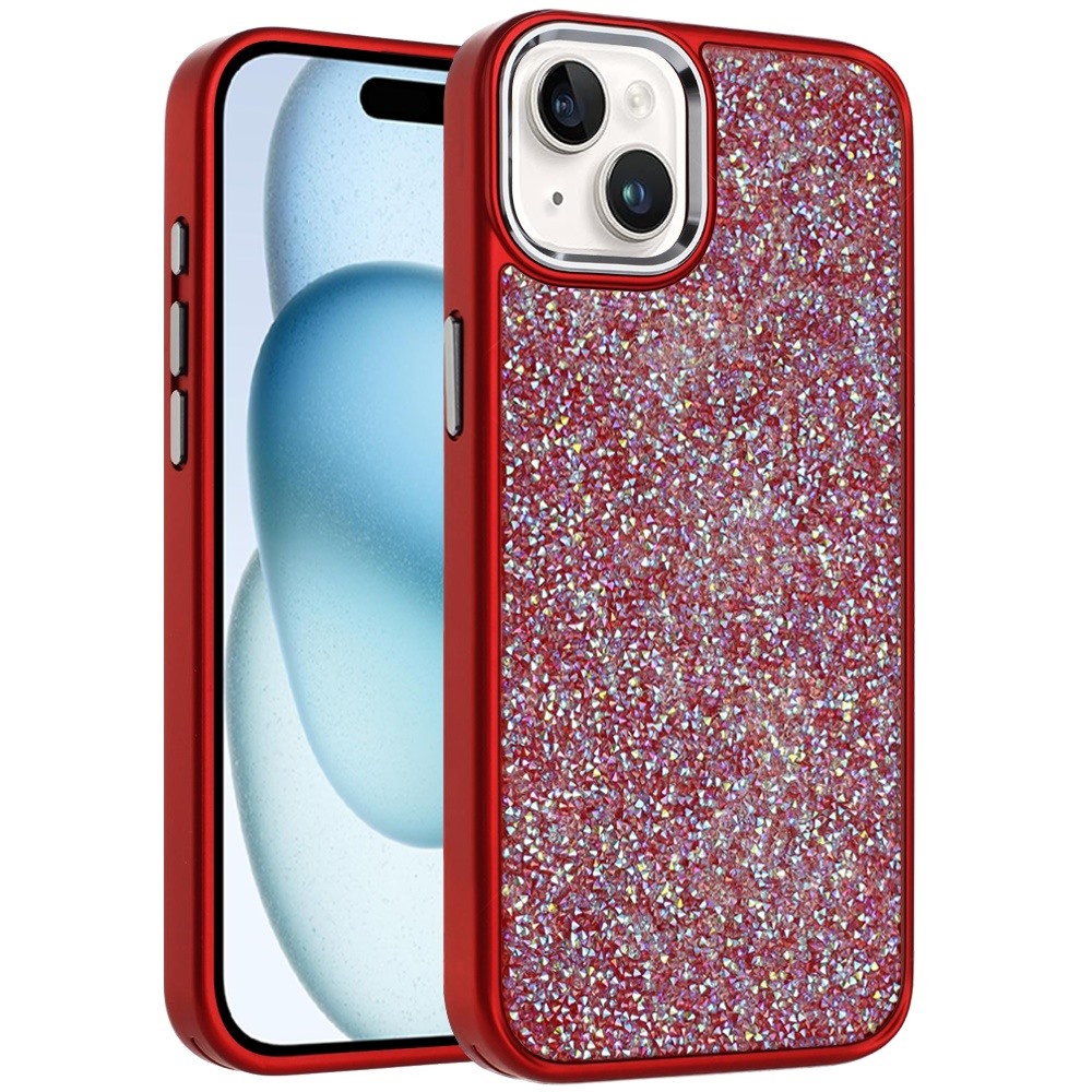 For iPhone 15 Crystal Glass Diamond with Metallic Buttons and Edges Hybrid Case - Red