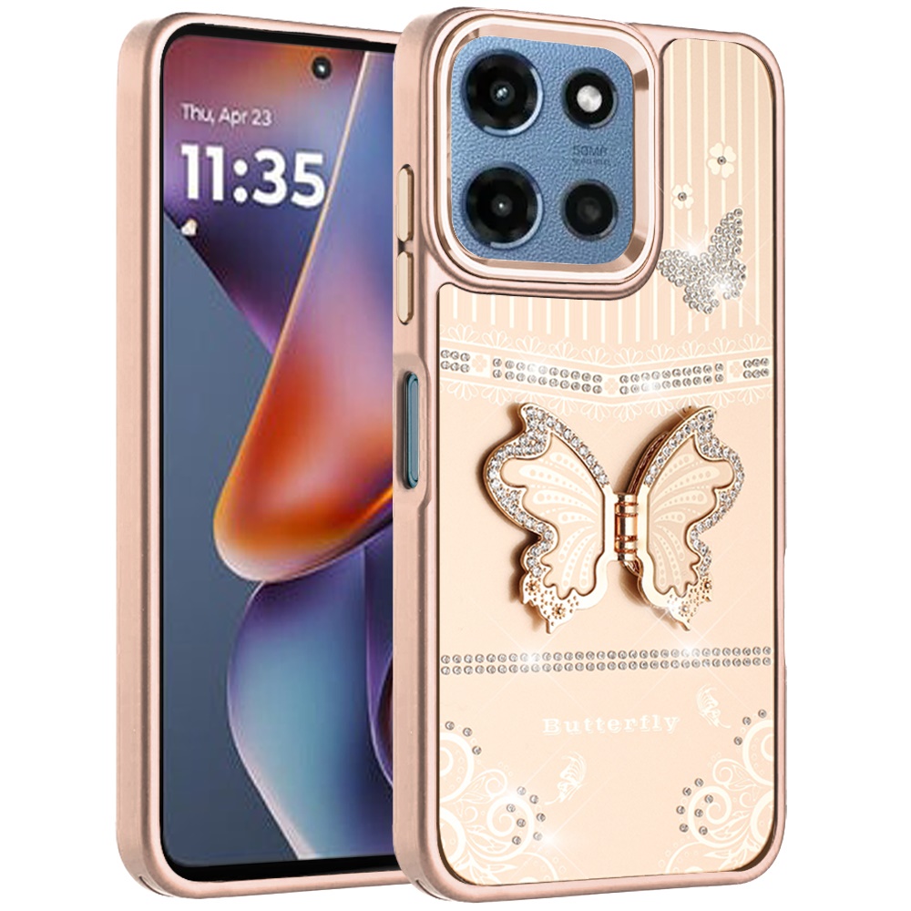 For Motorola Moto G 5G 2025 Splendid Glitter Butterfly Design Stand with Metallic Edges Hybrid Case - Gold