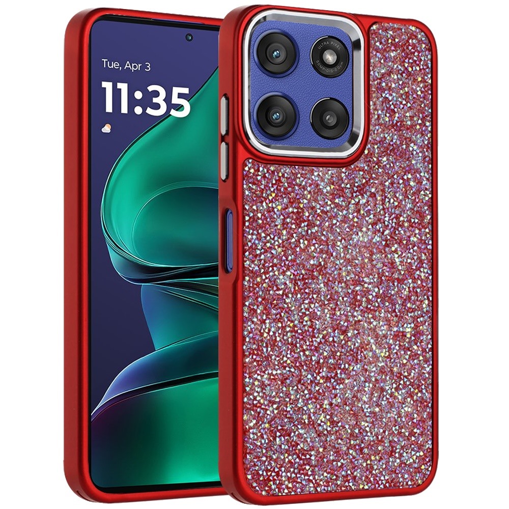For Moto G Stylus 5G 2025 Crystal Glass Diamond with Metallic Buttons and Edges Hybrid Case - Red