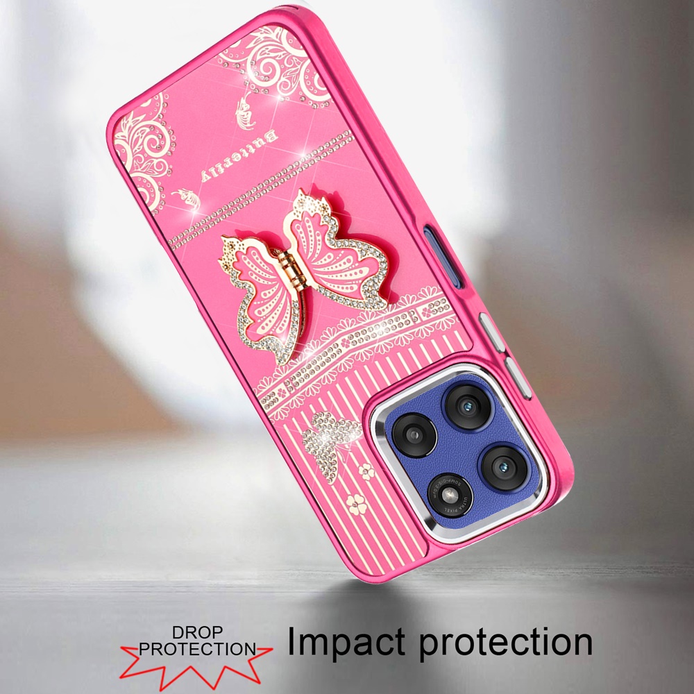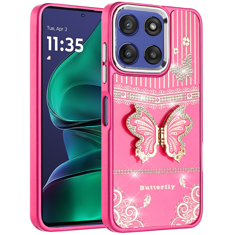 For Moto G Stylus 5G 2025 Splendid Glitter Butterfly Design Stand with Metallic Edges Hybrid Case - Hot Pink