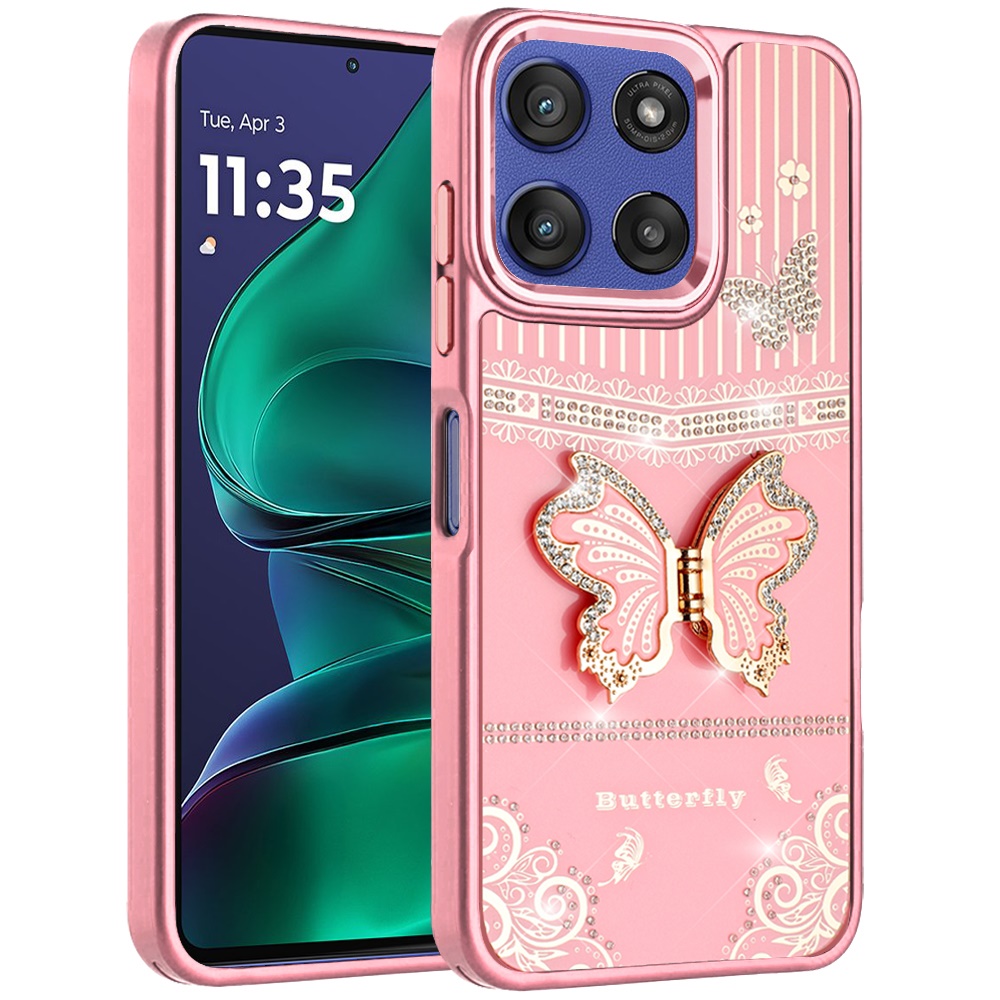 For Moto G Stylus 5G 2025 Splendid Glitter Butterfly Design Stand with Metallic Edges Hybrid Case - Light Pink