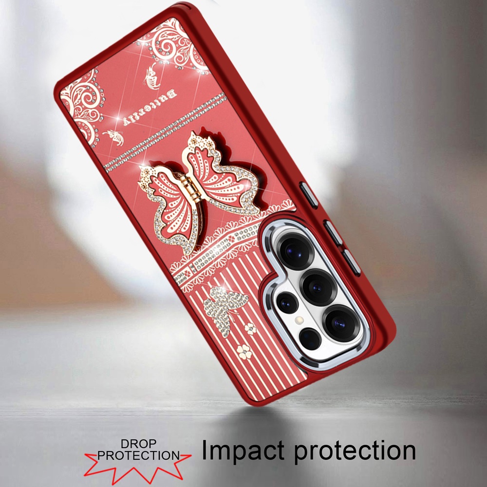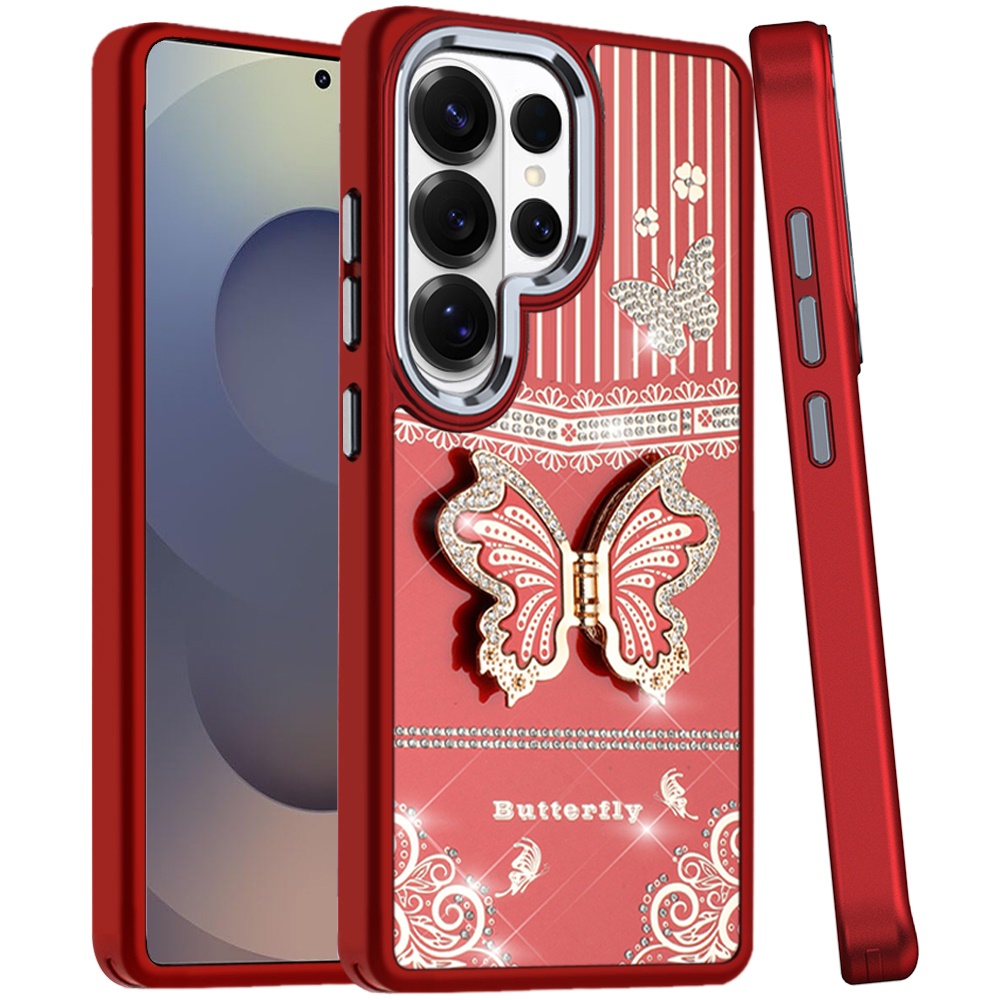 For Samsung s25 Ultra Splendid Glitter Butterfly Design Stand with Metallic Edges Hybrid Case - Red
