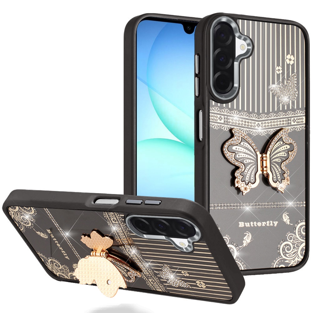 For Samsung A17 5G Splendid Glitter Butterfly Design Stand with Metallic Edges Hybrid Case - Black