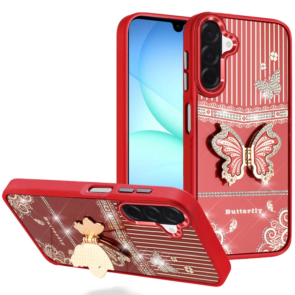 For Samsung A17 5G Splendid Glitter Butterfly Design Stand with Metallic Edges Hybrid Case - Red
