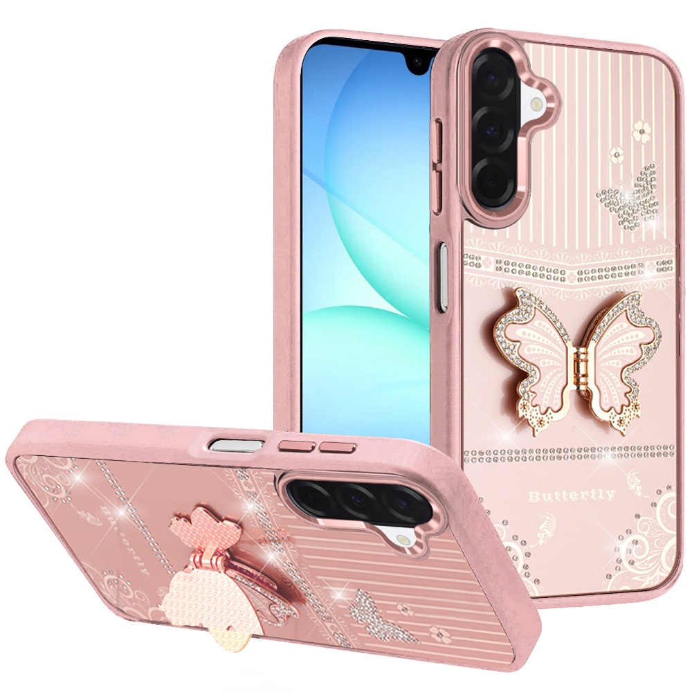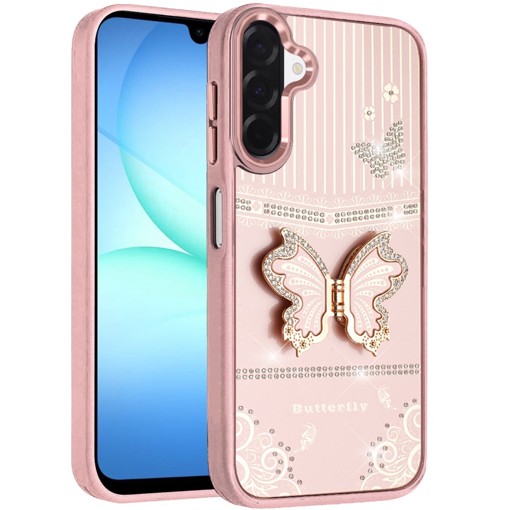 For Samsung A17 5G Splendid Glitter Butterfly Design Stand with Metallic Edges Hybrid Case - Rose Gold