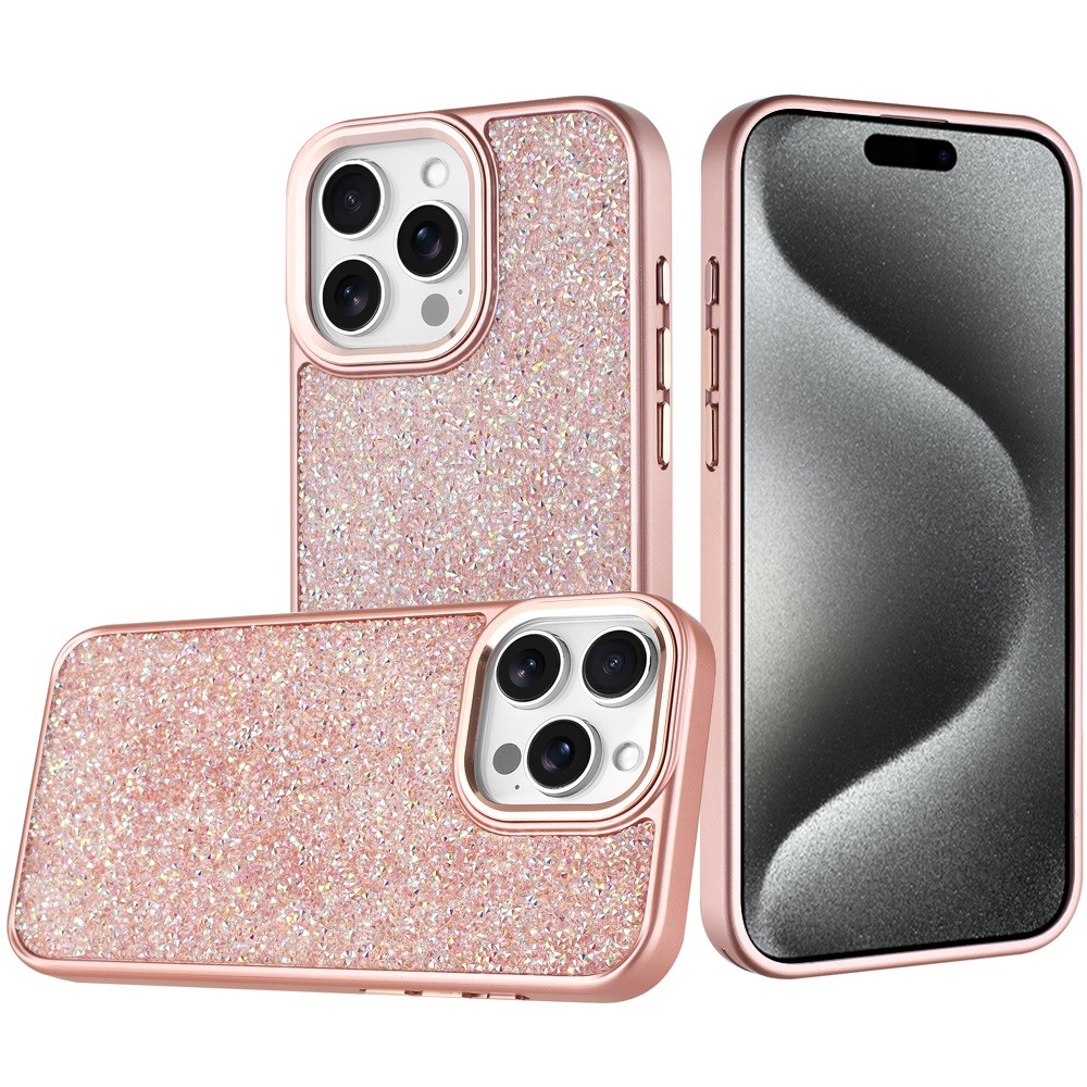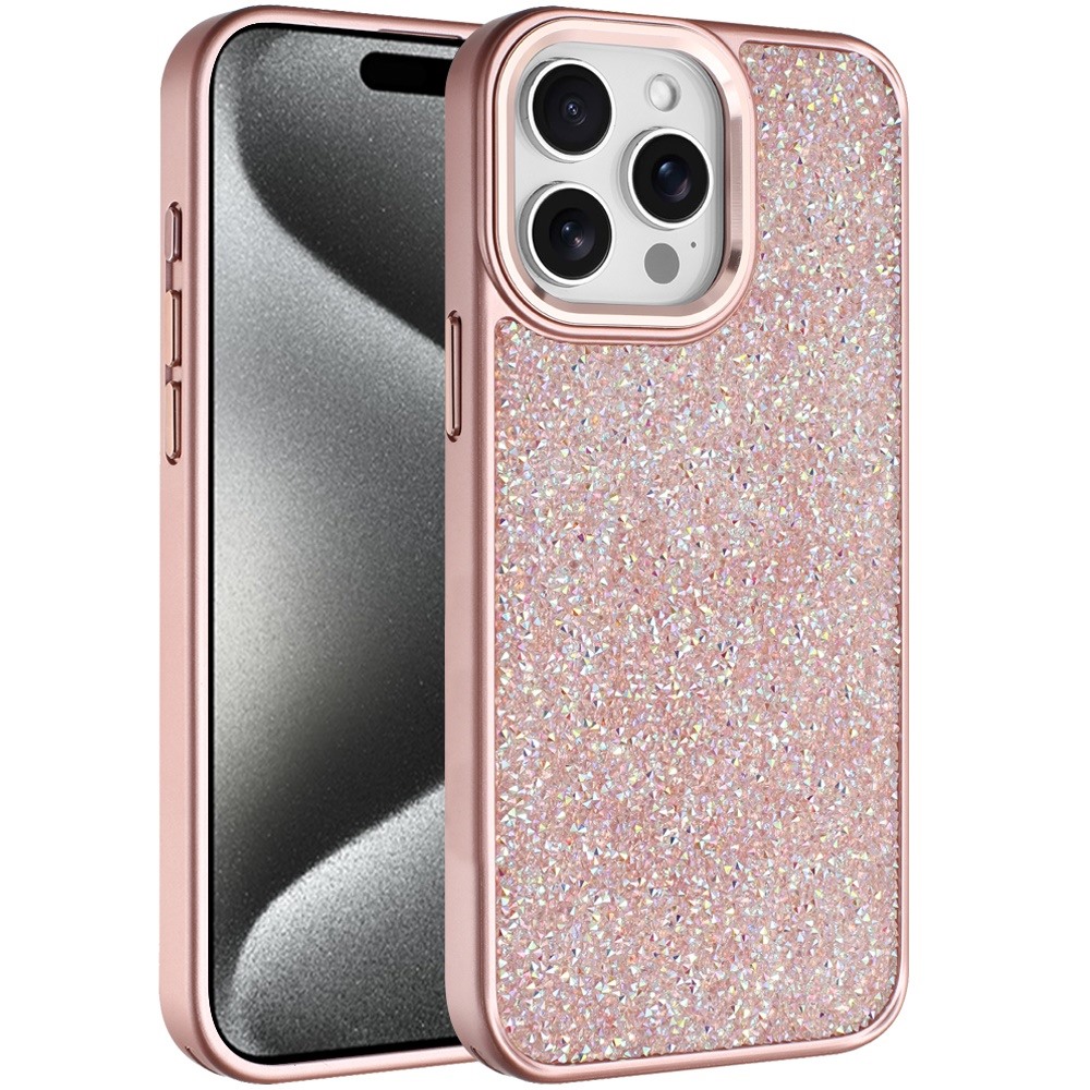 For iP15 Pro Max Crystal Glass Diamond with Metallic Buttons and Edges Hybrid Case - Rose Gold